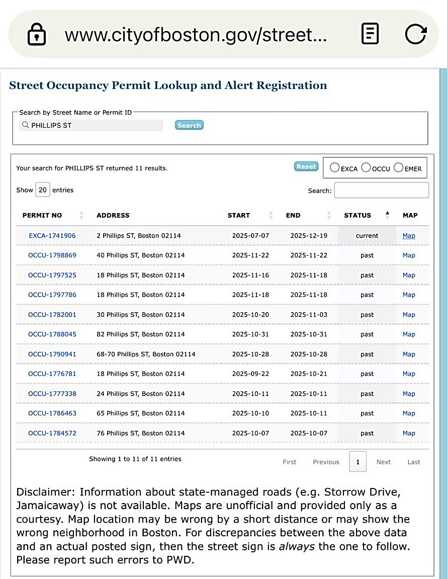 81 83 Phillips St, Boston, Ma, 02114I live on Phillips St in Beacon Hill. Construction has started going into the night this week (7am-1am 18 hours total on Monday, 7am-ongoing tonight). The signs only say they will be working during regular working hours. Furthermore, I saw on the city of Boston website they are only permitted to be working on the other side of Phillips St right now, and their permits for my end of the street are expired.