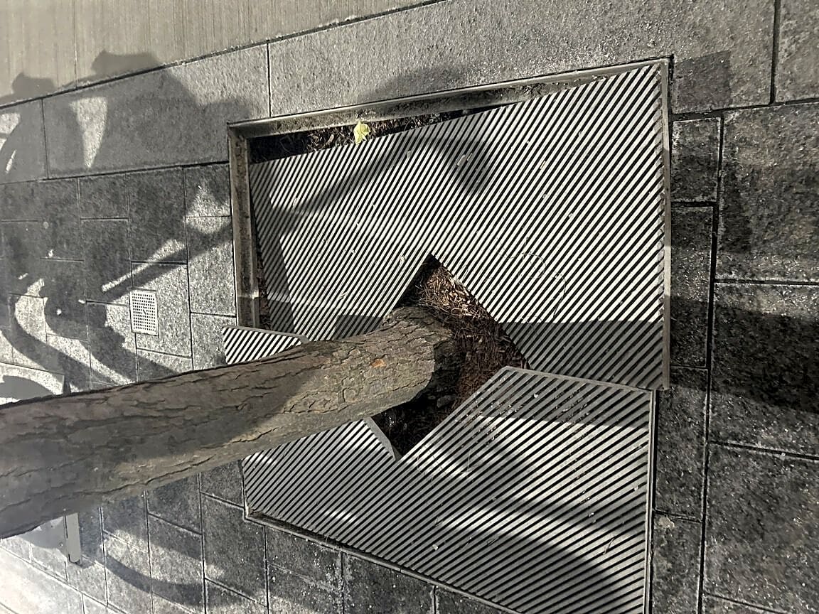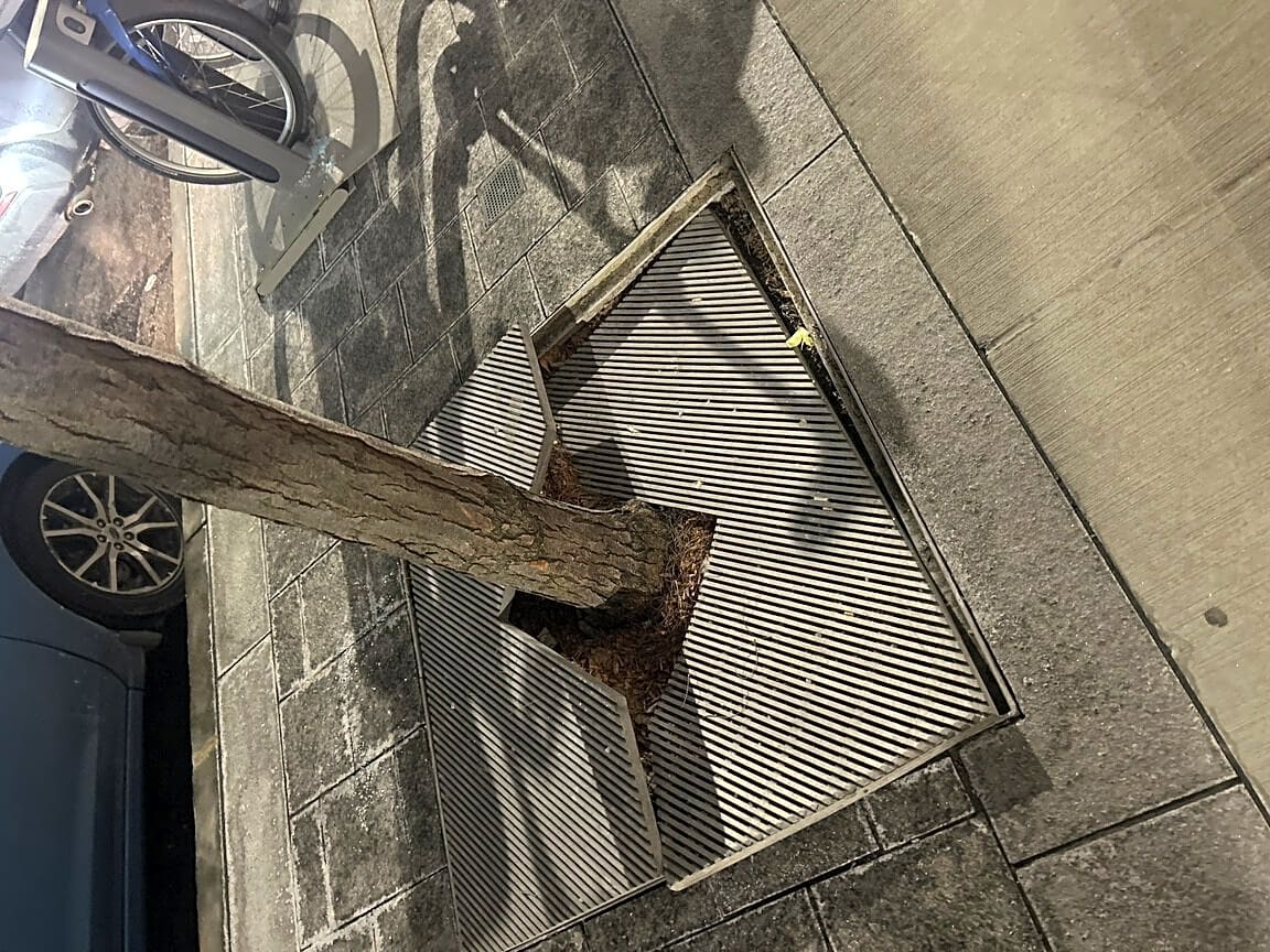 Intersection Of Pearl St And Milk St, Boston, MaDangerous sidewalk. Tree grate cover bent and out of place making it a trip hazard.