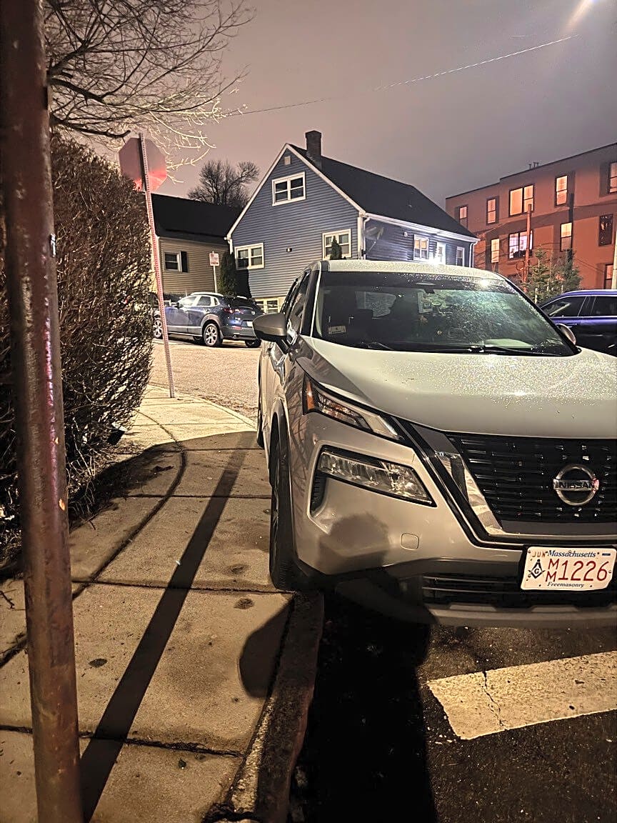 25 Wellington Hill St, Mattapan, Ma, 02126Cars are consistently parked at the spot on the corner of Wellington Hill and Ormond. This particular car is also parked on the sidewalk. You can see in the pictures that these cars are parked in between a stop sign and the line for the stop sign, right in front of and often obstructing the crosswalk. This also means that if you are approaching the stop sign you have to go around whatever car is parked here while avoiding any oncoming traffic.
