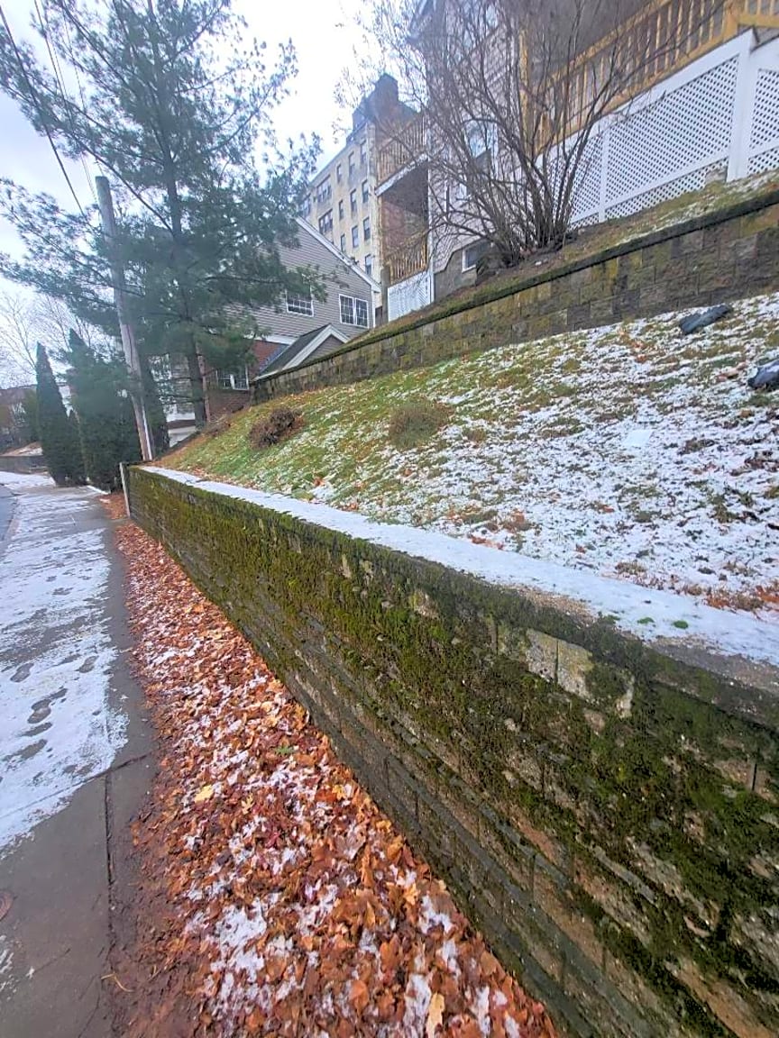 15 Radnor Rd, Brighton, Ma, 02135Loose trash in 1st tier of front grass by bushes. There are a pair of discarded black shoes and a face mask sitting on the front grass there