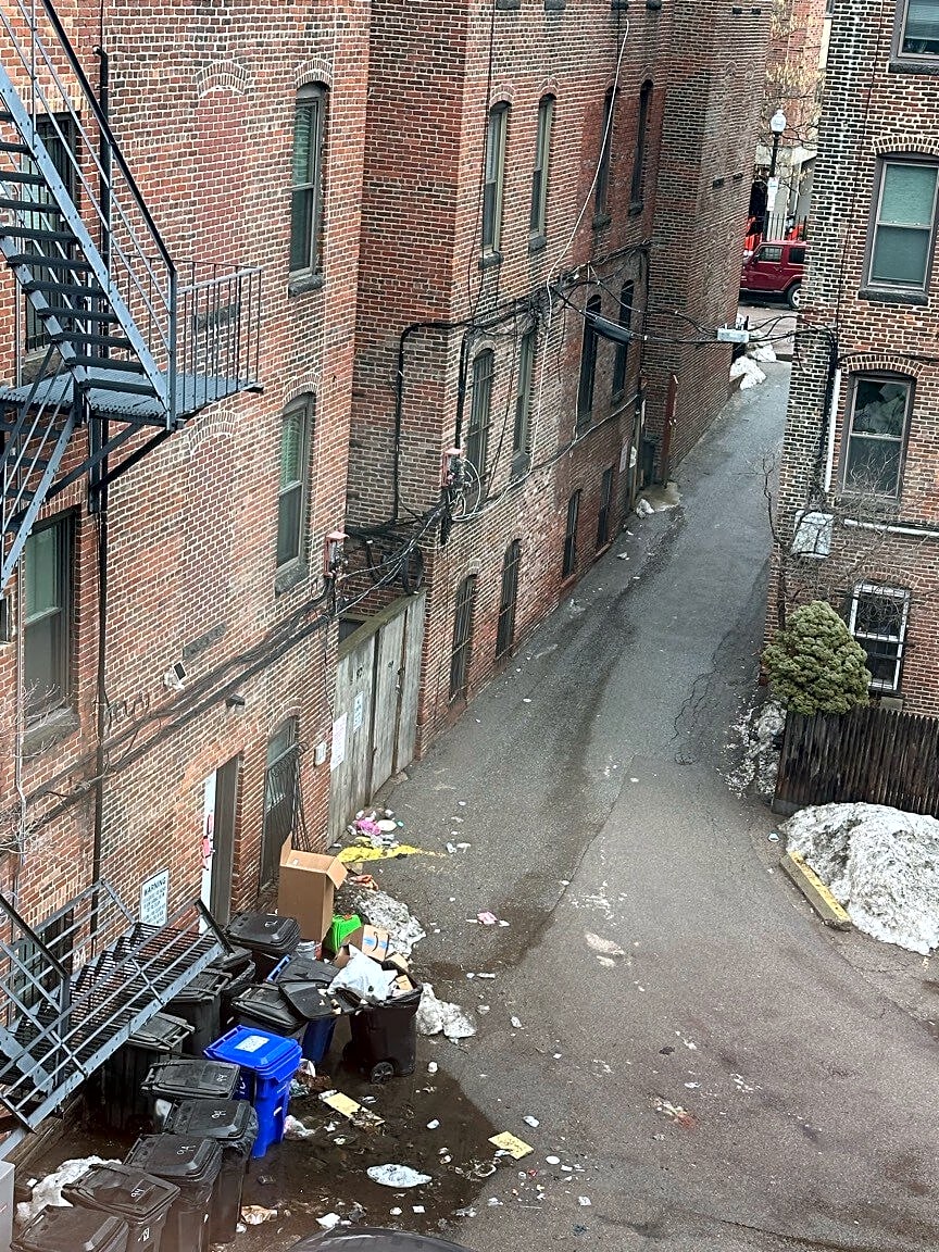 96 Saint Botolph St, Boston, Ma, 02116Trash strewn about the alley. Open trash barrel. Poor sanitation