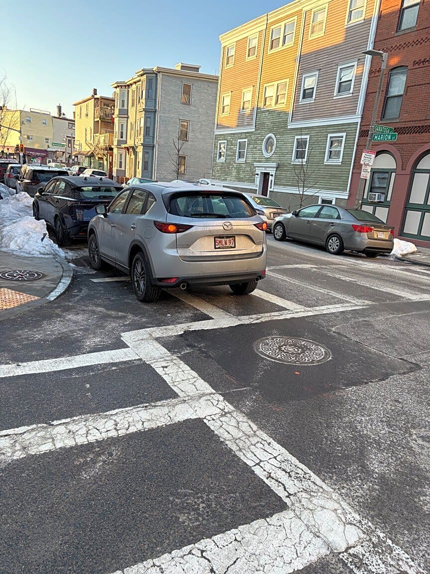 Intersection Of Marion St And Saratoga St, East Boston, MaCar blocking sidewalk