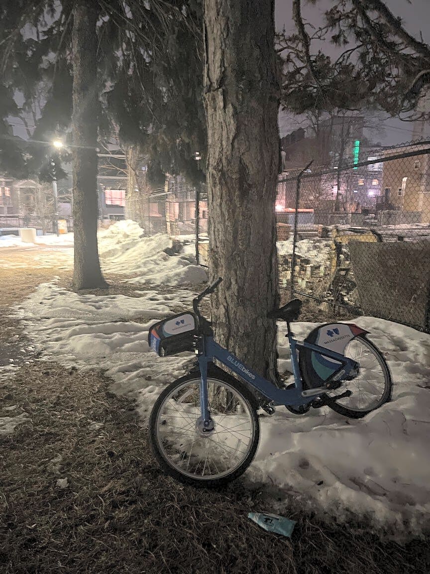 267 Amory St, Jamaica Plain, Ma, 02130Abandoned blue bike in SW corridor park next to YES construction site