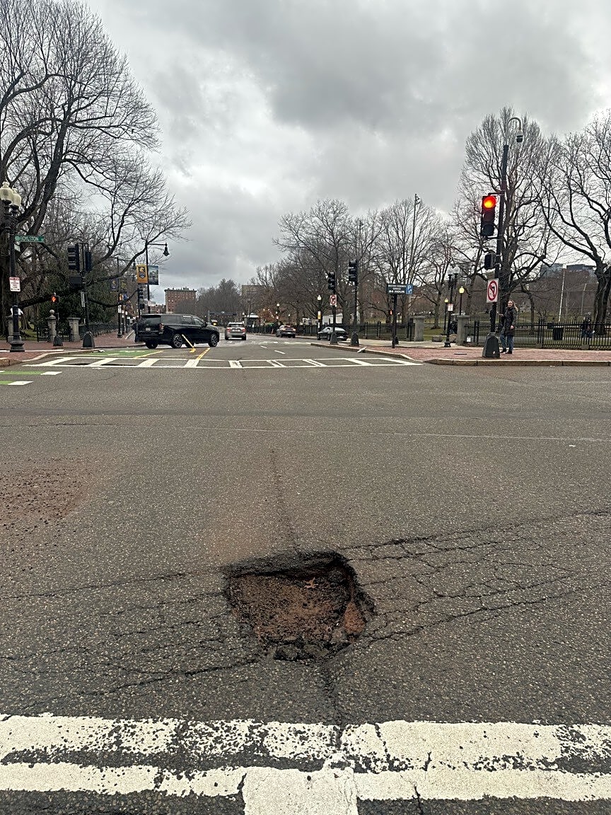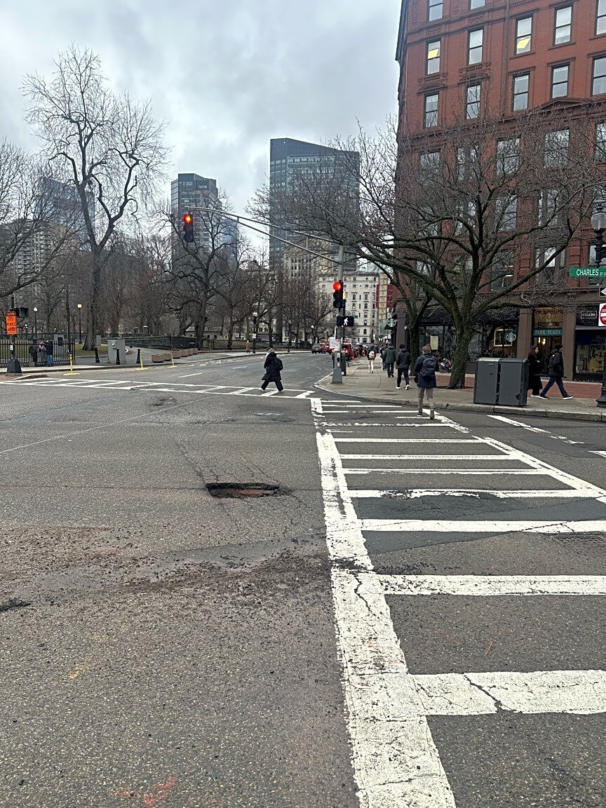 Intersection Of Charles St S And Boylston St And Charles St, Boston, MaThere’s a really deep pothole at the intersection of Charles St S and Boylston St. This pothole is so deep, I was driving Sunday night on a rainy day and it broke something underneath my car. Now my car is in the shop. I took a video yesterday of it happening to another car of the impact of this pothole.