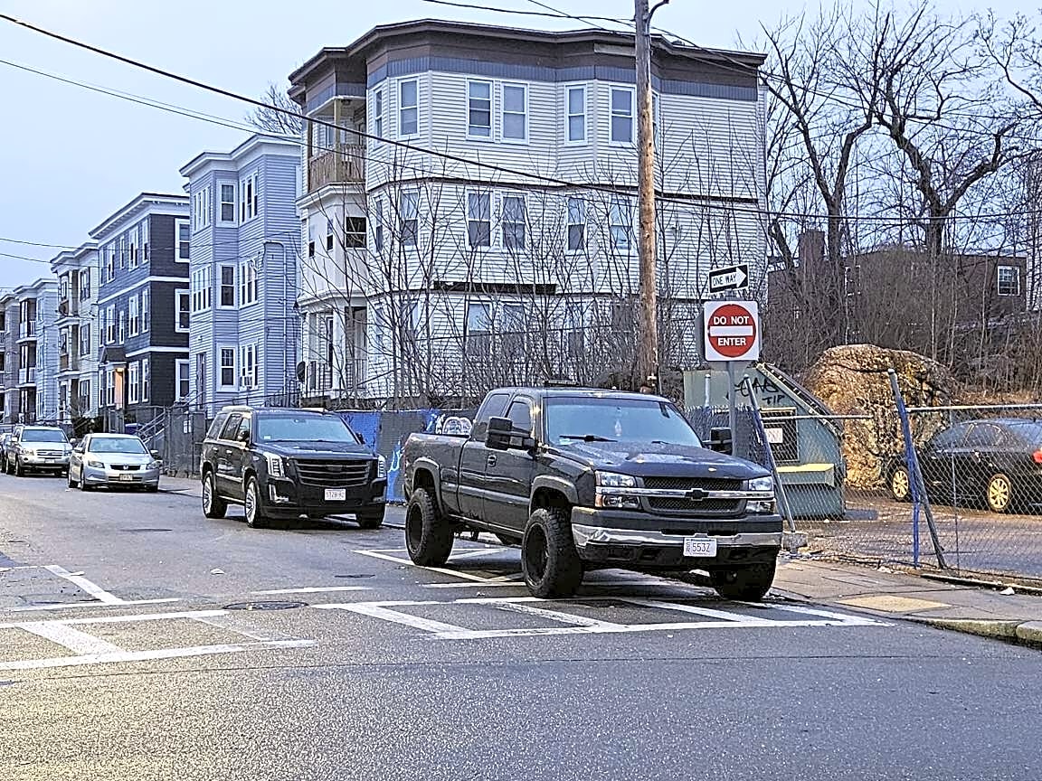 Intersection Of W Second St And B St, South Boston, MaCar parked on island/ peninsula making it difficult for large trucks to get through intersection.