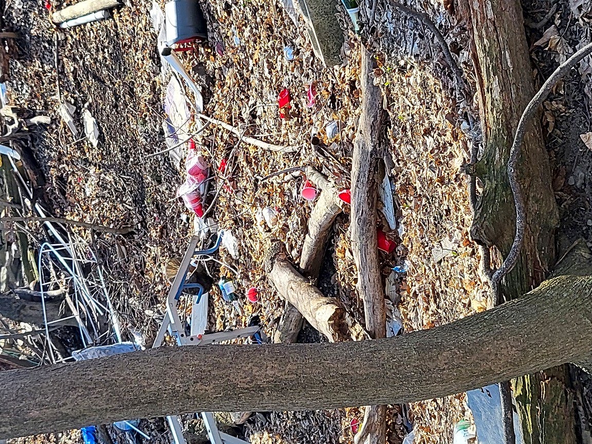 198 200 Calumet St, Mission Hill, Ma, 02120My wife and some neighbors did a trash pick up on the wooded hillside between Calumet and Hillside Streets. This is a nice green area which allows those on Hillside and Calumet to see some green trees, birds and turkeys. Unfortunately, some renters see this only as a dumping ground - particularly the tenants who live at 198/200 Calumet. It is a party house for the student who party hard and often. All through the cold they had big blue tarps around the back of the house, complete with heat lamps, big sound system, and lights, which you can see in one of the photos. We were all young once and did our share of partying, but not to the detriment of the neighborhood. For the most part they shut it down around 11 PM, but the mess they leave is inexcusable. During the cleanup, my son went up while they were outside and politely asked them to pick up their trash which he pointed out. Their response "sure man, no problem" resulted in nothing but words... There are lots of parties up on Calumet which neighbors call about, but until landlords jump in and take some action, our complaints will continue. The police have come from time to time and have broken up the parties, but they continue.