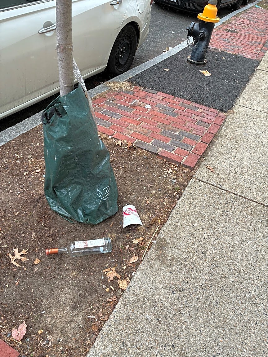 59 Burbank St, Boston, Ma, 02115Wine bottle and debris. In tree well near fire hydrant. Thanks.
