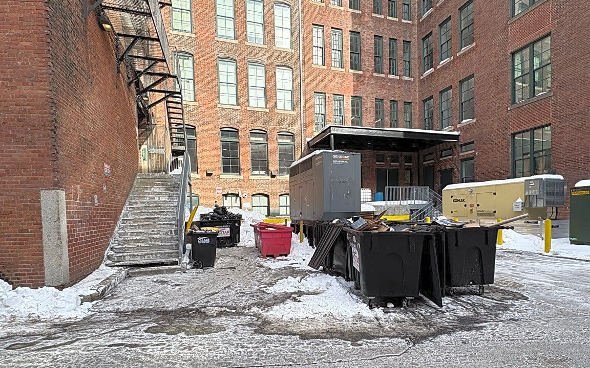 49 Melcher St, Boston, Ma, 02210Multiple overflowing dumpsters and trash bins behind 49 & 51 Melcher St on Necco Ct.