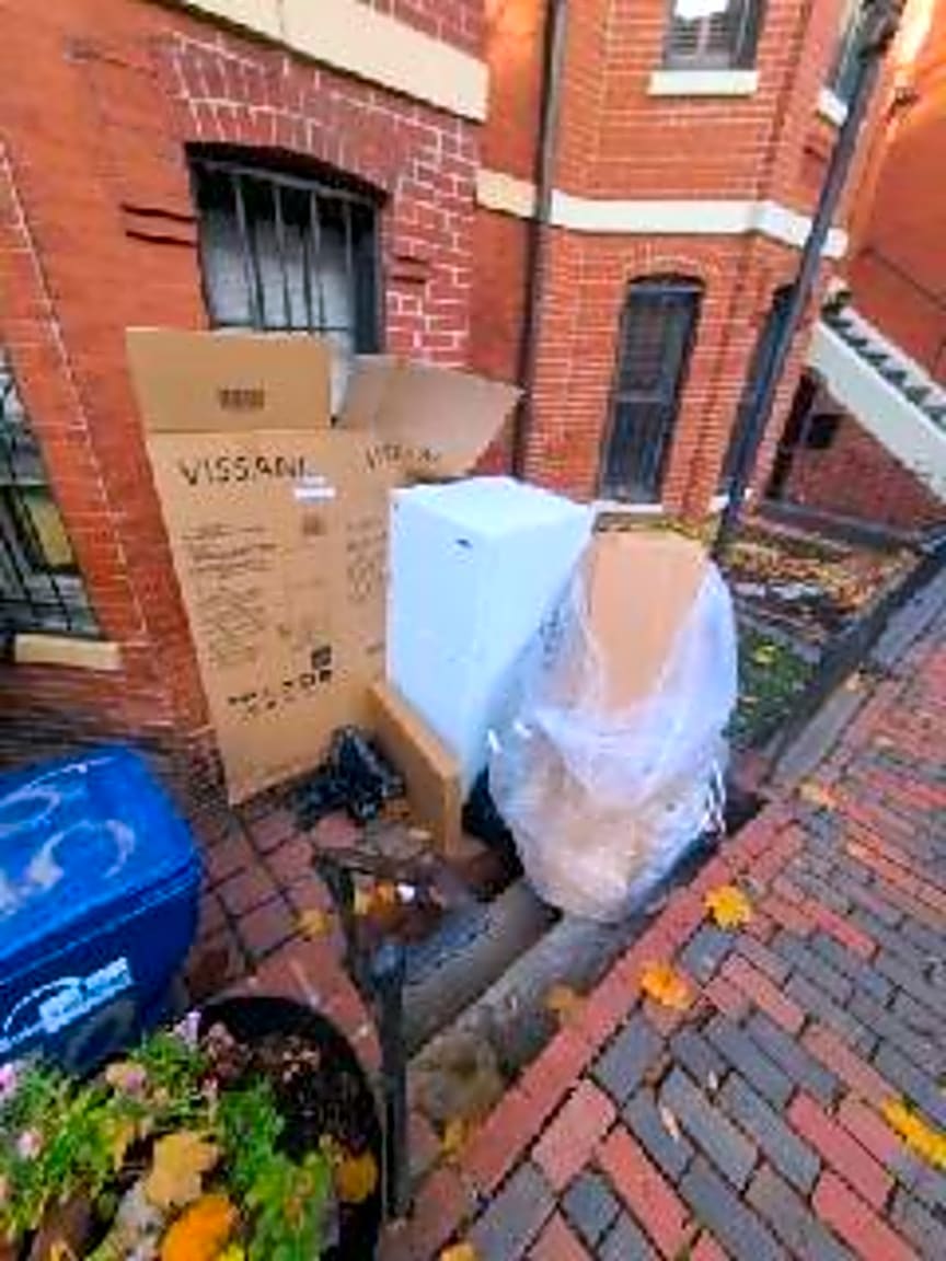 5 Union Park, Roxbury, Ma, 02118Recycling/cardboard and packaging on sidewalk in front of 3 and 5 Union Park next to the tree.