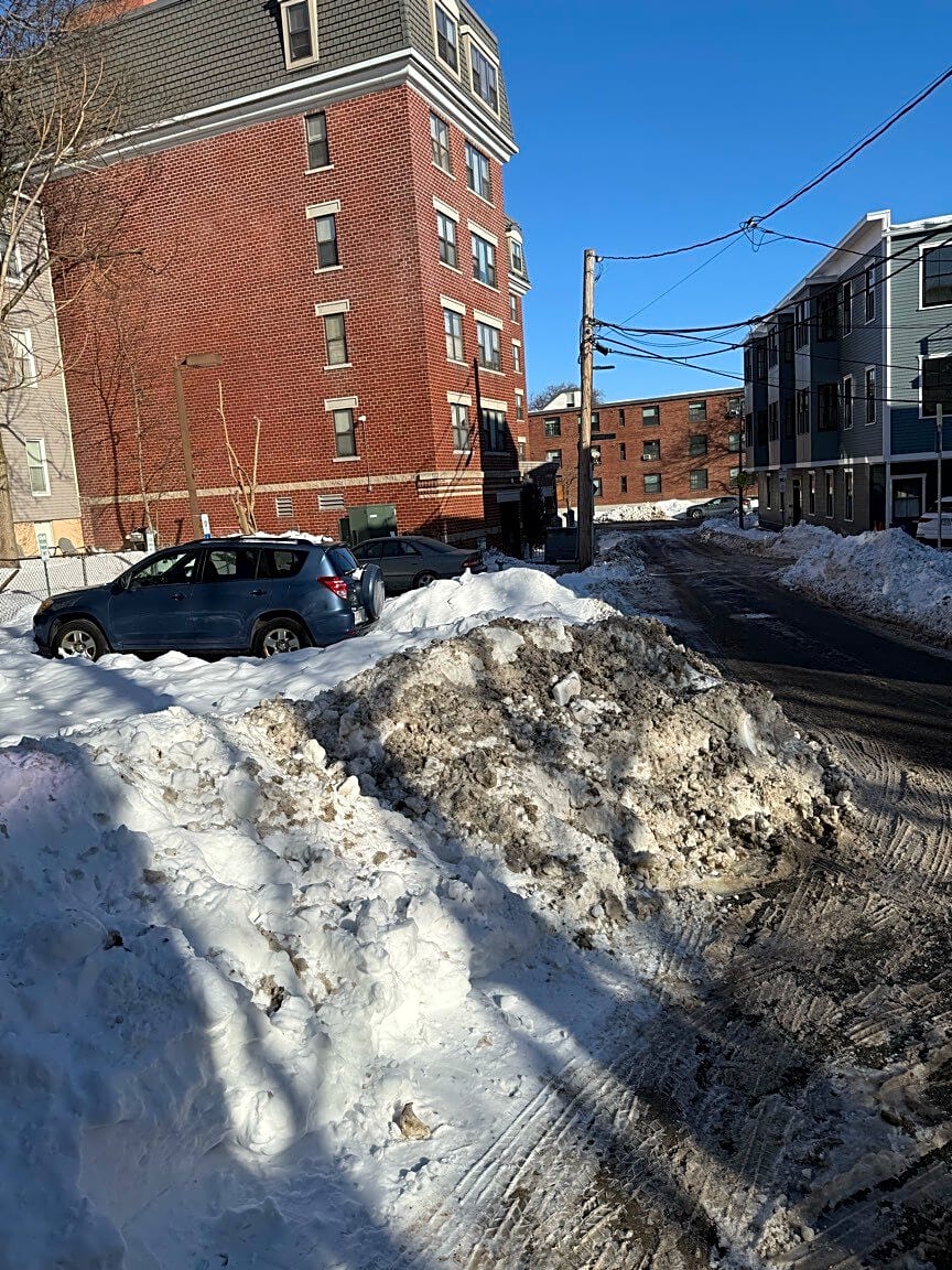 Intersection Of Hickory Ave And Ferrin St, Charlestown, MaThis parking lot is owned by Robert A. Georgine Towers and has not shoveled the sidewalks. They are unwalkable and people have to walk in the street. It’s 5 das after the storm and this is completely unacceptable. Pls ticket.