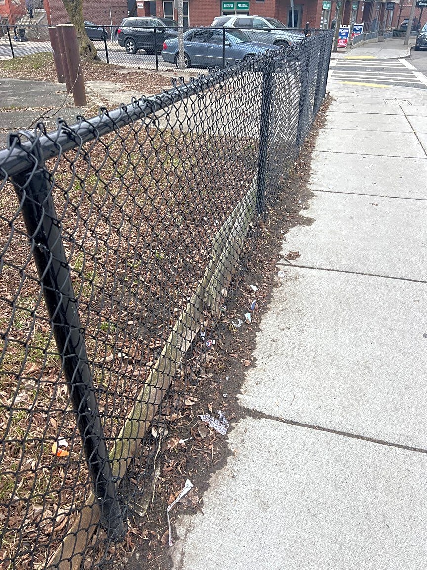 581 Dudley St, Dorchester, Ma, 02125Needle in front of gate on sidewalk Dudley Street and Brook Avenue cross from light Post