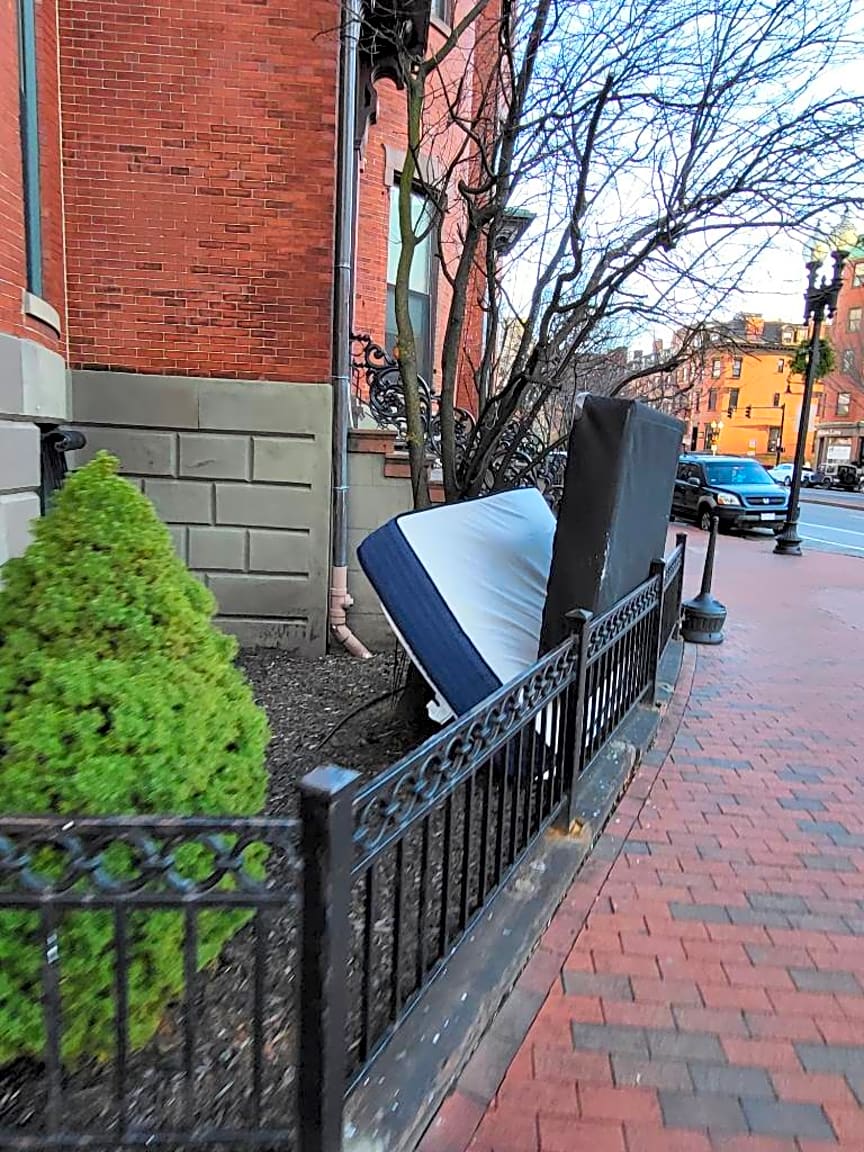 CLOSED #101006441839Case Resolved. Thank you for contacting Boston 311. You can schedule a mattress pick up online at Boston.gov. The metal frame and wooden plank can be placed out for trash pick up. If you have any questions or concerns, please call us at 3-1-1.