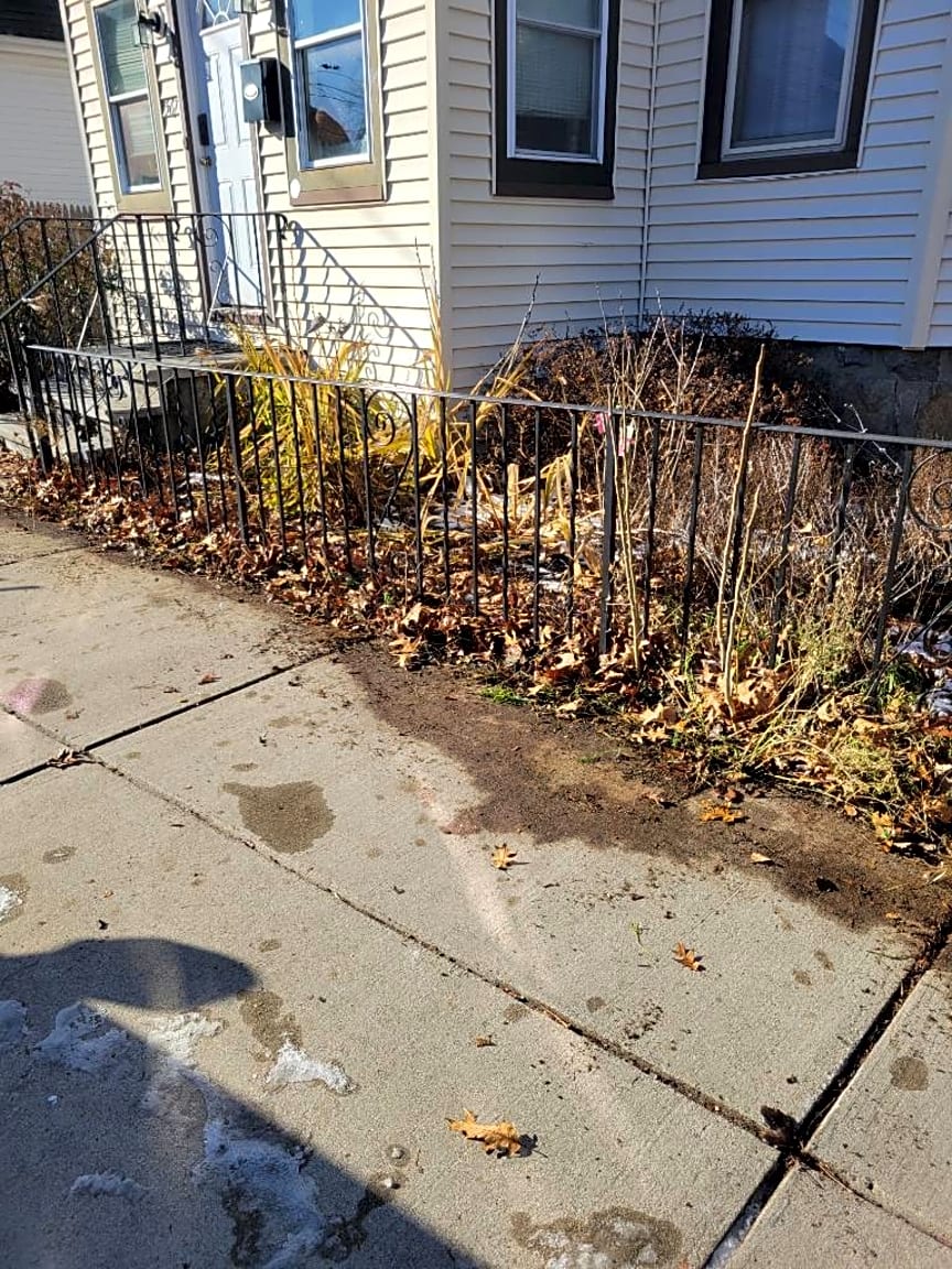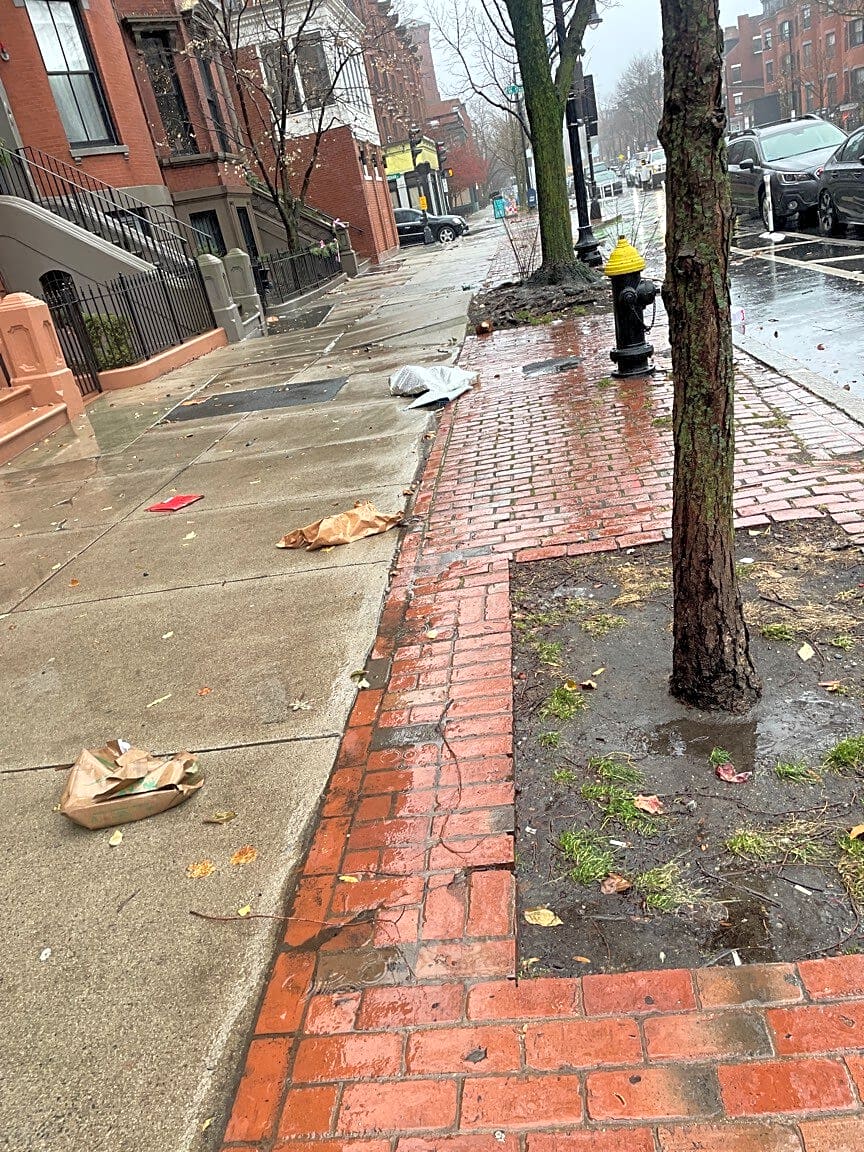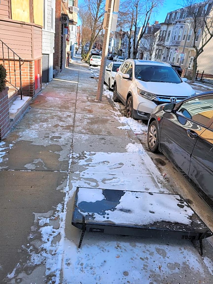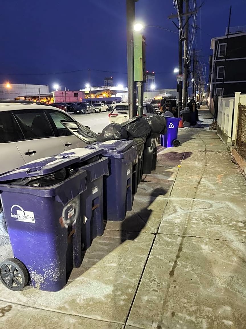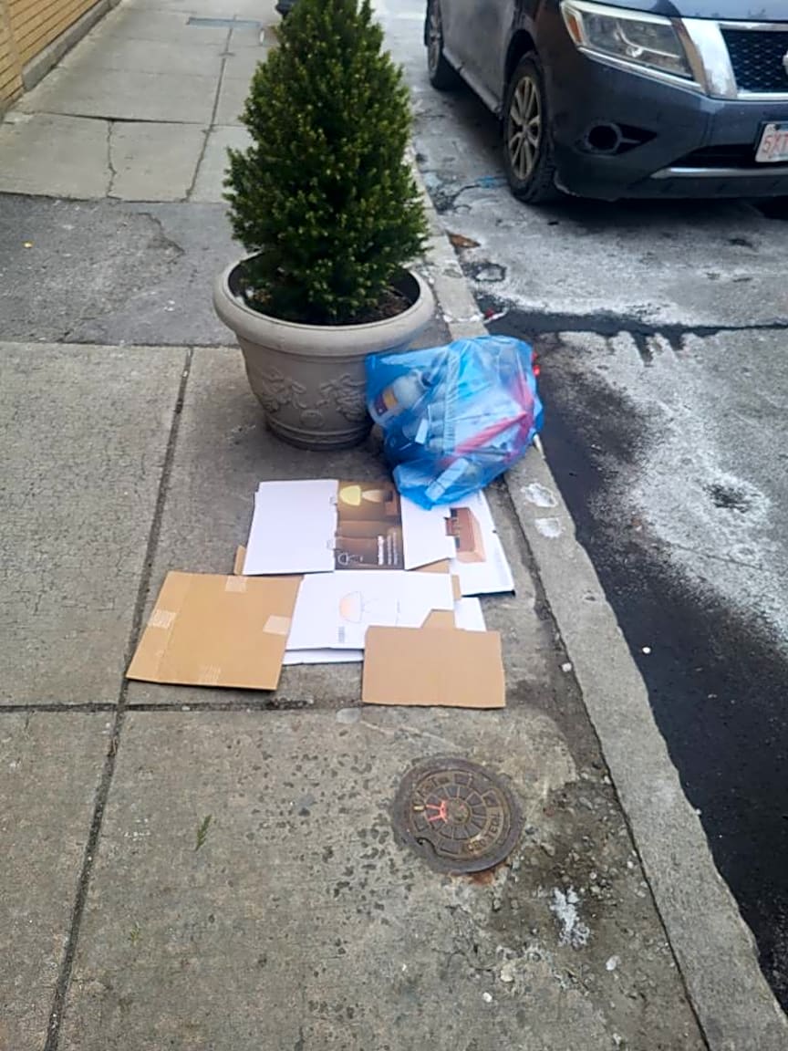 50 Saxton St, Dorchester, Ma, 02125Trash can out all week, trash bag left on sidewalk, and rugs on the curb (now covered in snow)