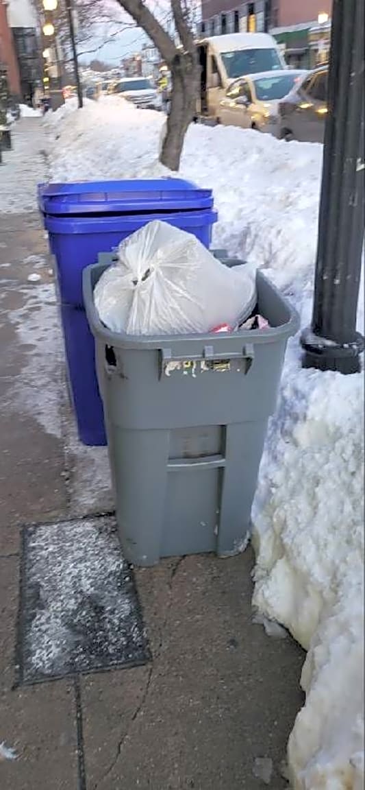 536 E Broadway, South Boston, Ma, 02127Emptied barrels left out on sidewalk | 536 E Broadway trash cans out on sidewalk, they: [ushed them over onto 538 E broadway rather than put them away] Exact location: [front]