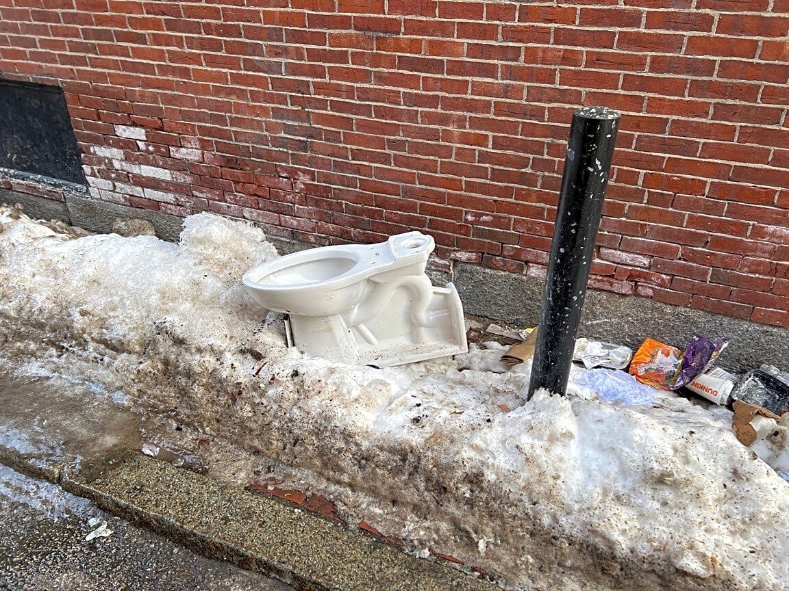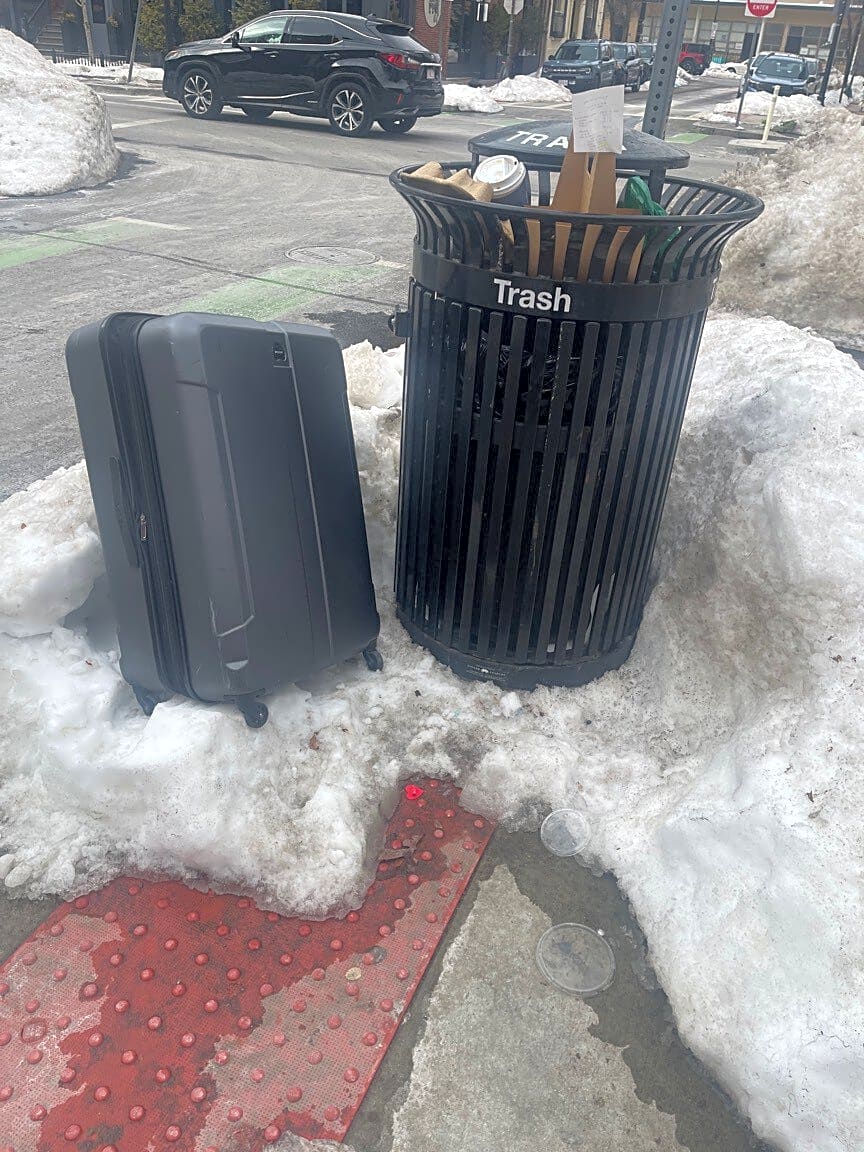 Intersection Of Union Park And Tremont St, Roxbury, MaDiscarded suitcase and over filled barrel