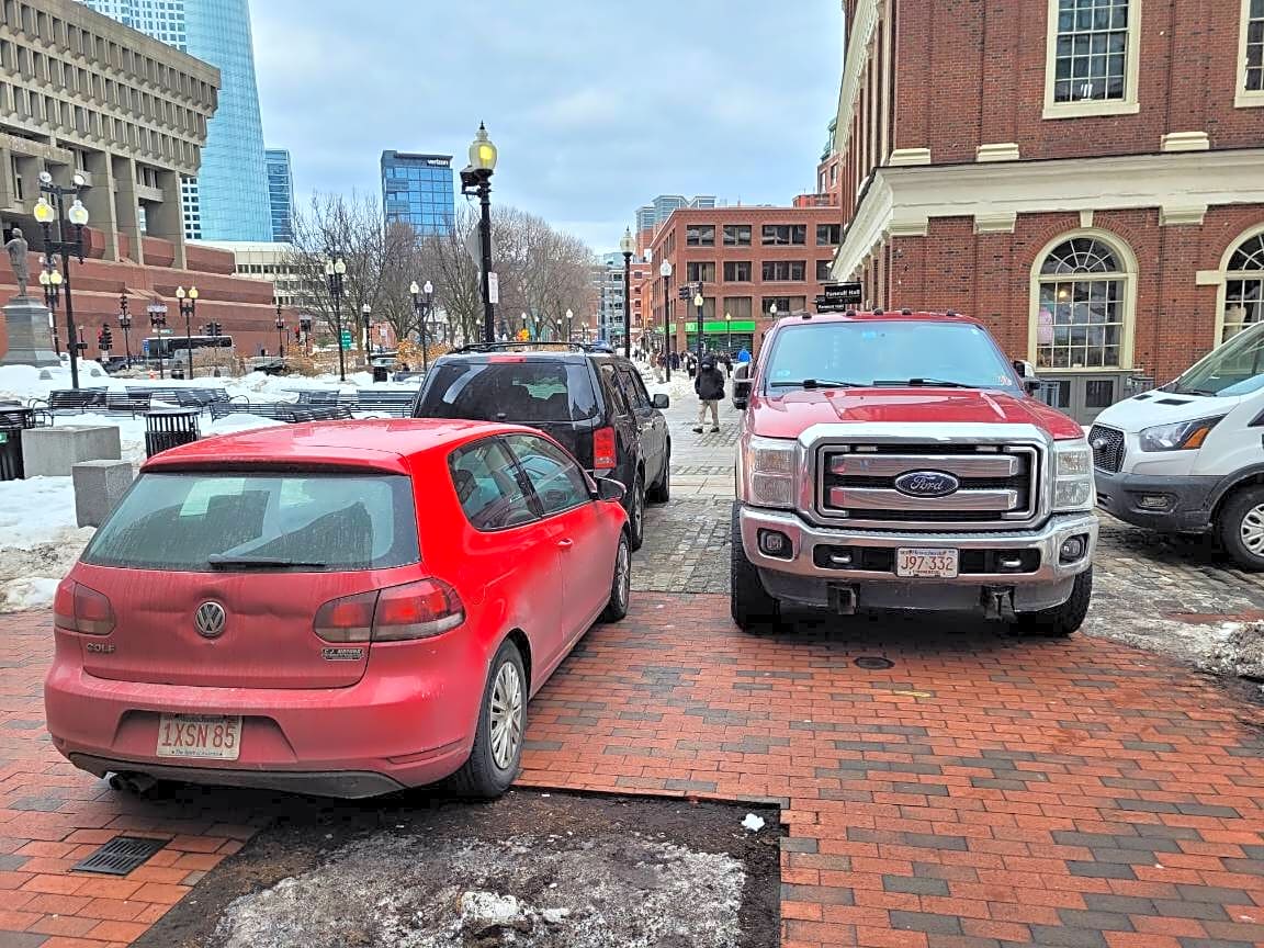 1 2 Faneuil Hall Sq, Boston, Ma, 02109Faneuil hall is not a free parking zone. Please ticket the red VW Golf MA 1XSN85, red Ford Super Duty MA J97332, black Honda Pilot MA 510B, uhaul van too.