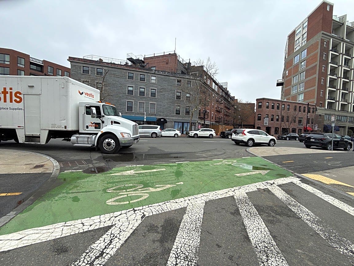 85 Atlantic Ave, Boston, Ma, 02109Delivery truck and vehicle stopped on Atlantic Avenue blocking traffic. And blocking the exit to Commercial Wharf again.