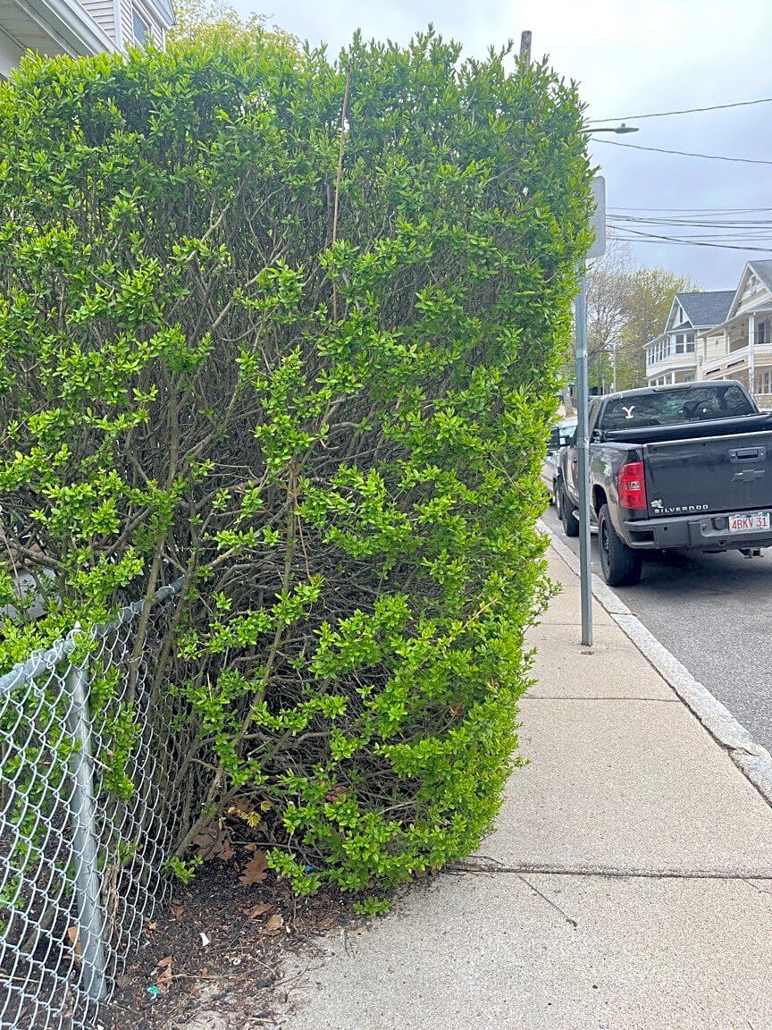 30 Brooks St, Brighton, Ma, 02135Sidewalk is nearly blocked by overgrown Bush which needs trimming back to the fence. With the Street sign it is nearly impossible for strollers or kids on bikes to get through on their way to Hobart Park up the street. I submitted this two months ago as a “pruning request”, but no action has been taken as I think that went to a tree division. Someone just needs to tell the landlord to cut it.