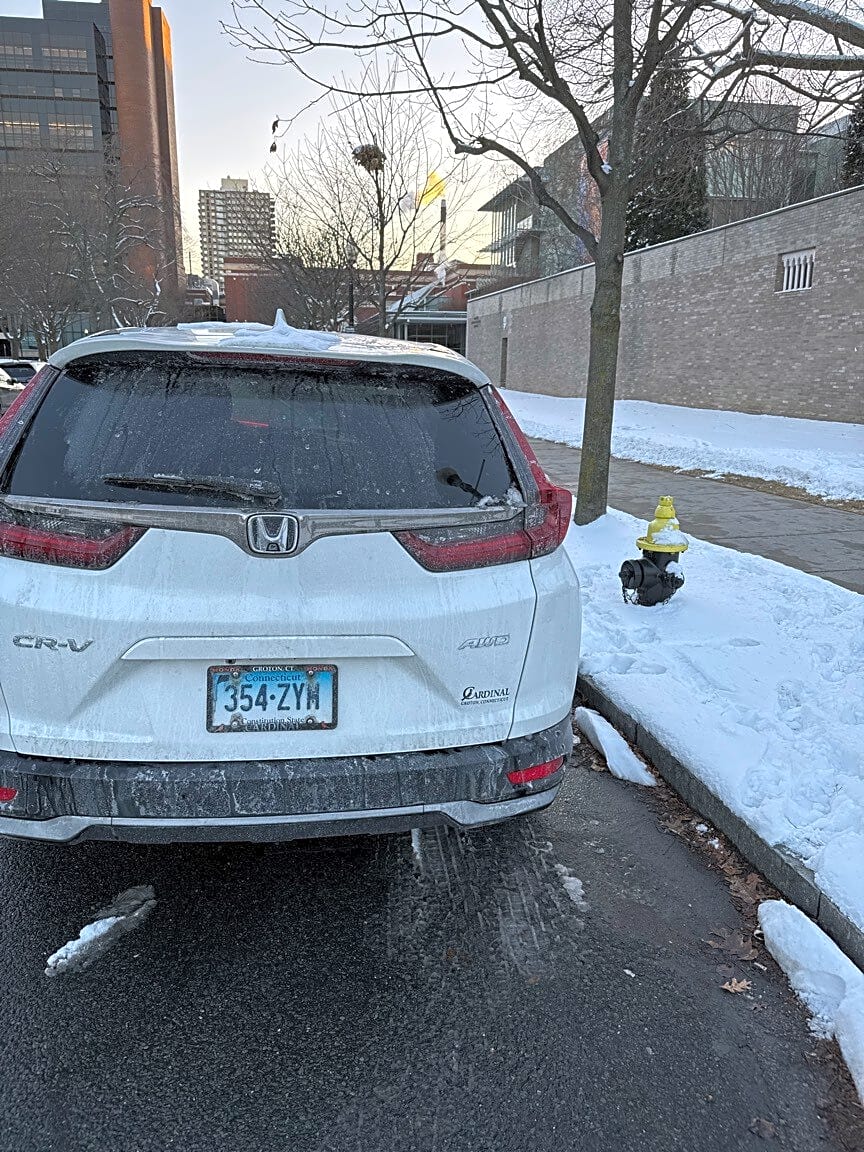 36 Evans St, Dorchester, Ma, 02124How is the car parked illegally: [Blocking hydrant] Type of vehicle: [SUV] Make: [Honda] Model: [SUV] Color: [White] Vehicle License Plate Registration: [354ZYM] Vehicle License Plate State: [CT]