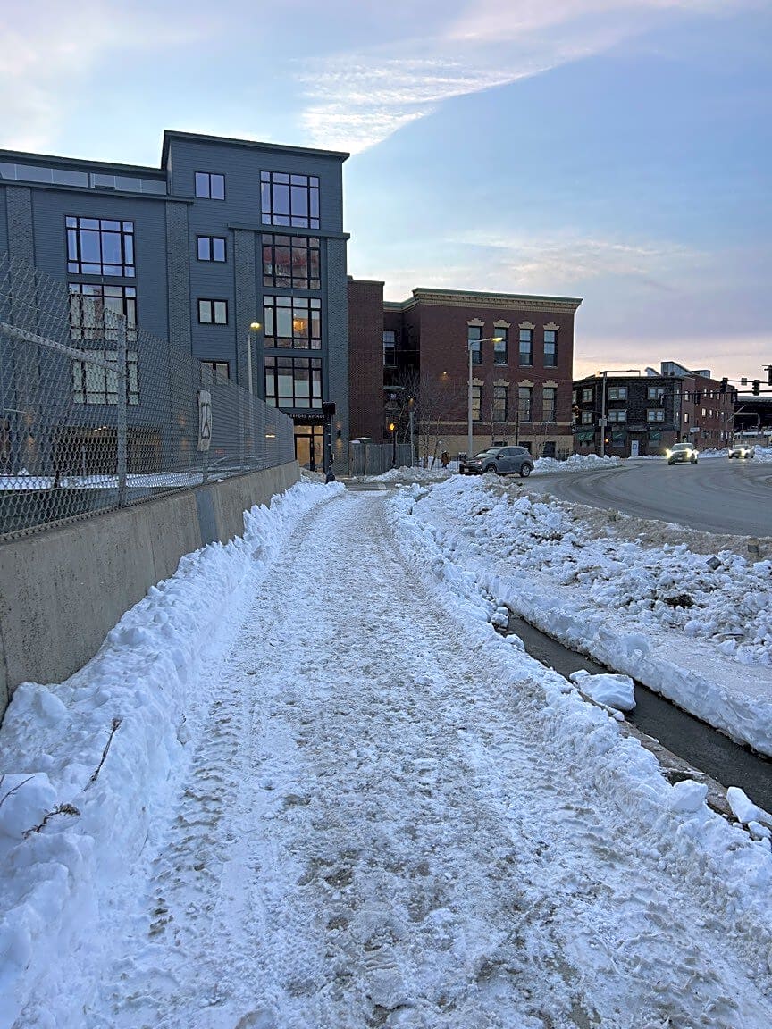 Intersection Of Sullivan Sq And Rutherford Ave, Charlestown, MaSnow not removed from sidewalk and deep enough that it is very slippery