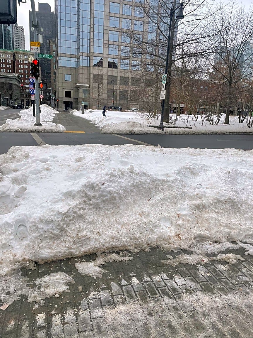 Intersection Of State St And Long Whf And Atlantic Ave, Boston, MaCrosswalk not shoveled in front of Aquarium station on Atlantic Ave.