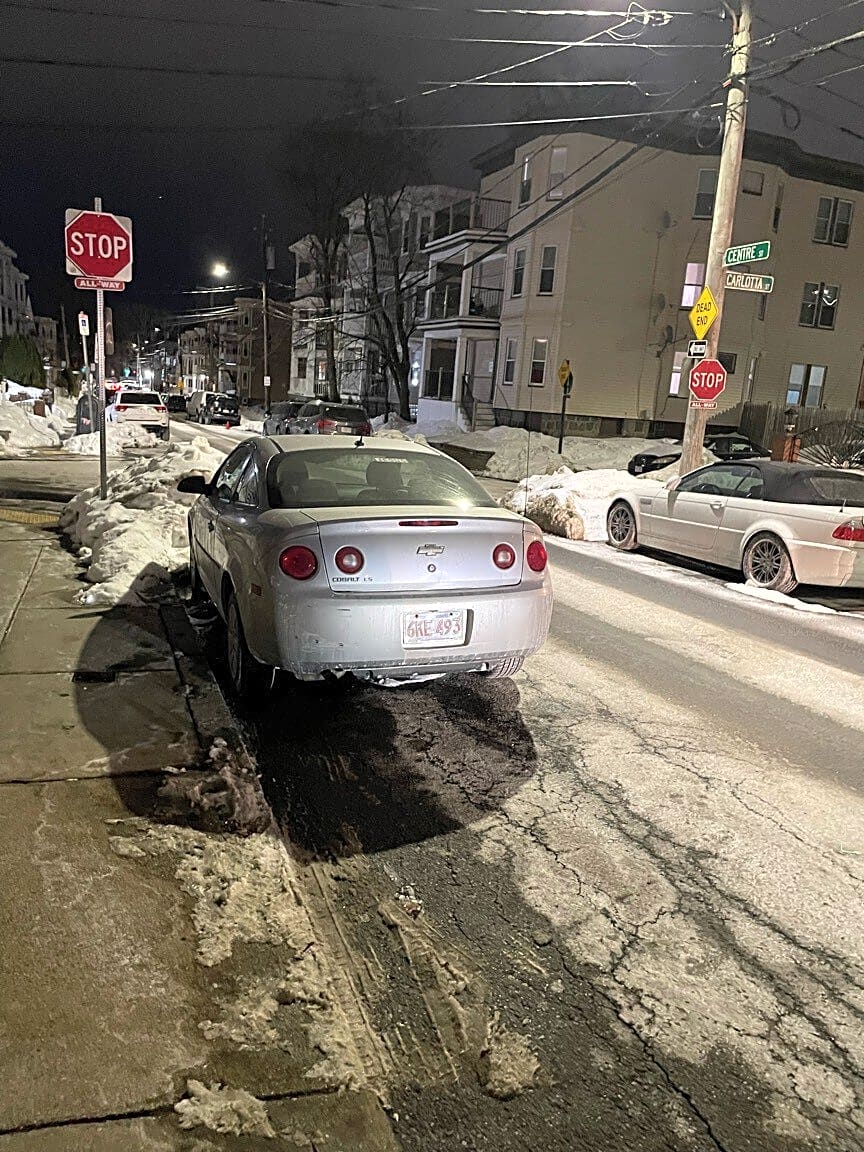 356 Centre St, Dorchester, Ma, 02122Gray Chevy cobalt MA license 6KE493 parked in tow zone and blocking access to the driveway.