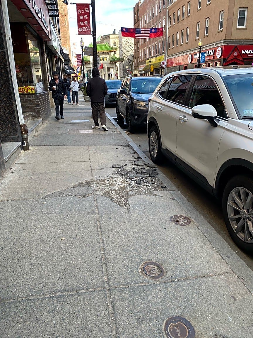 50 H 50 Beach St, Boston, Ma, 02111Sidewalk is broken in Chinatown. It’s hard to walk side by side because sidewalk is too narrow now.