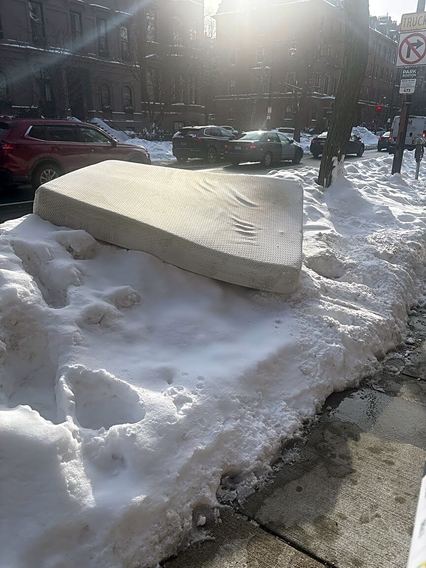 122 Beacon St, Boston, Ma, 02116Mattress on snow pile on sidewalk at 124 Beacon St (river side of street).