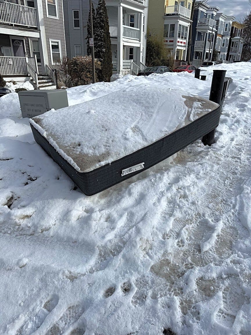 15 Hillock St, Roslindale, Ma, 02131Mattresses on curb/snowbank