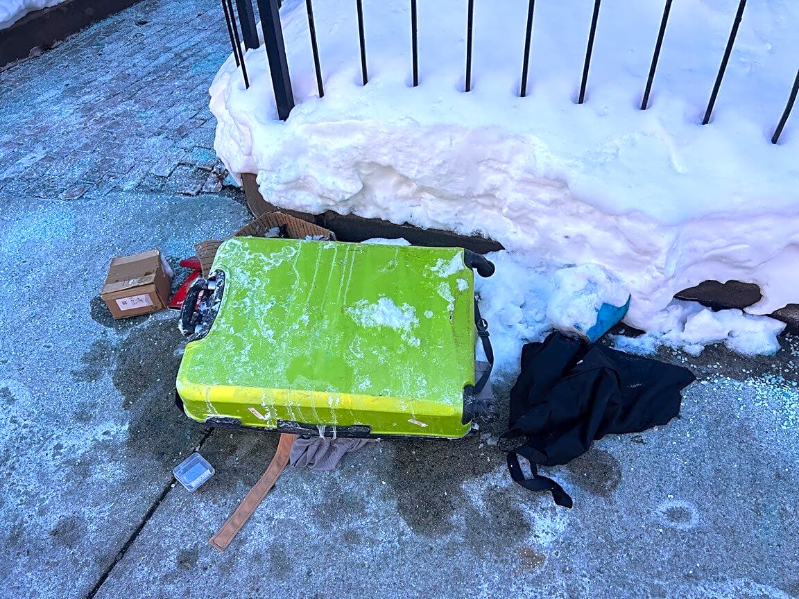17 Hastings St, West Roxbury, Ma, 02132Sapce savers on street, states buckets/chairs/chairs connected by rope/bins | Type of debris: [Other] Cars parked on the street: [No]