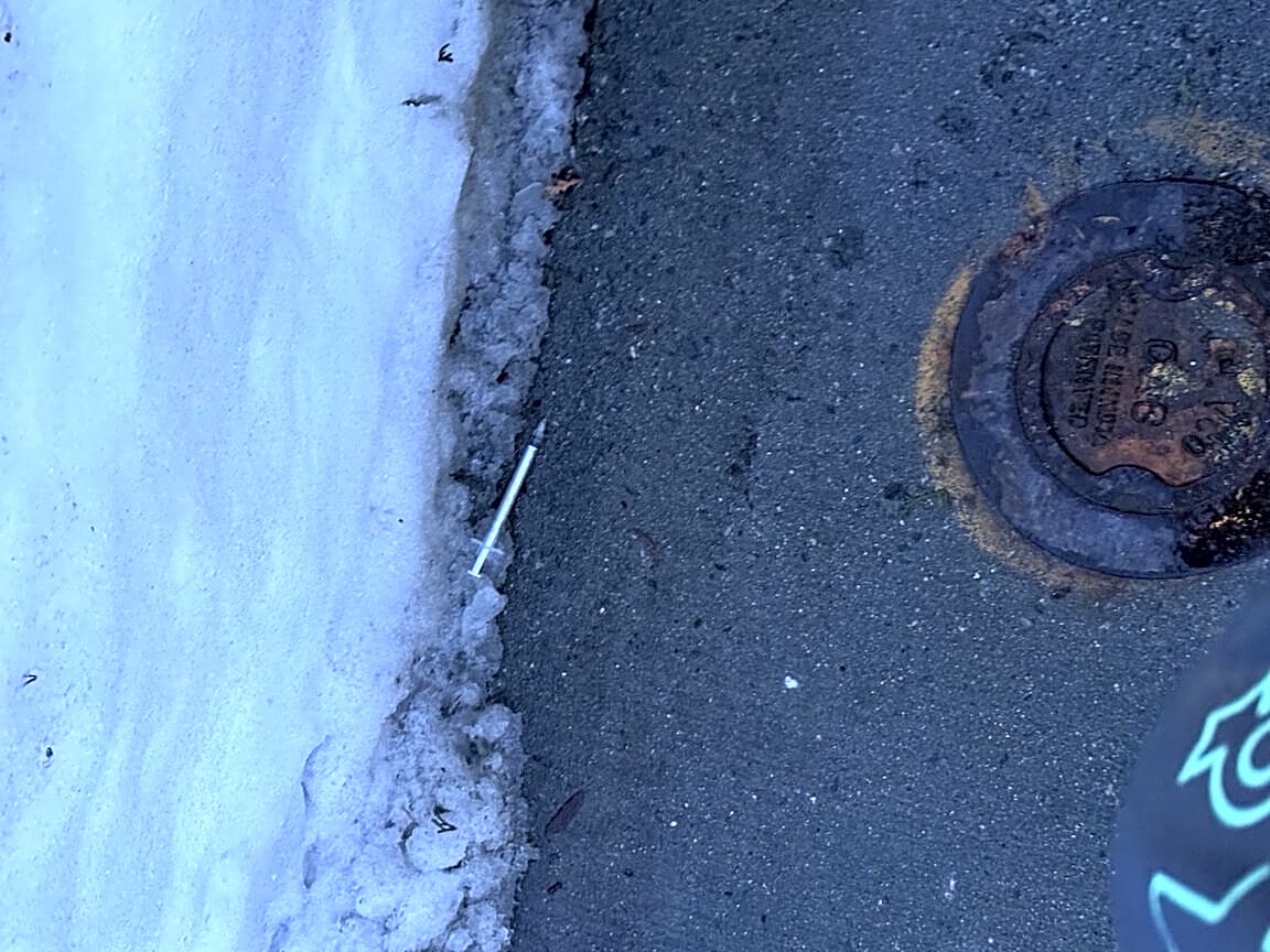 Intersection Of W Fourth St And E Berkeley St And Albany St, Roxbury, MaHypodermic needle on the sidewalk outside of Troy Boston highway side near the intersection of east Berkeley and Albany st