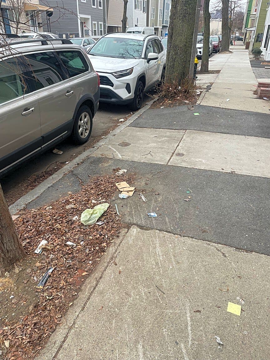 Intersection Of Christopher St And Dorchester Ave, Dorchester, MaLot trash on the grass