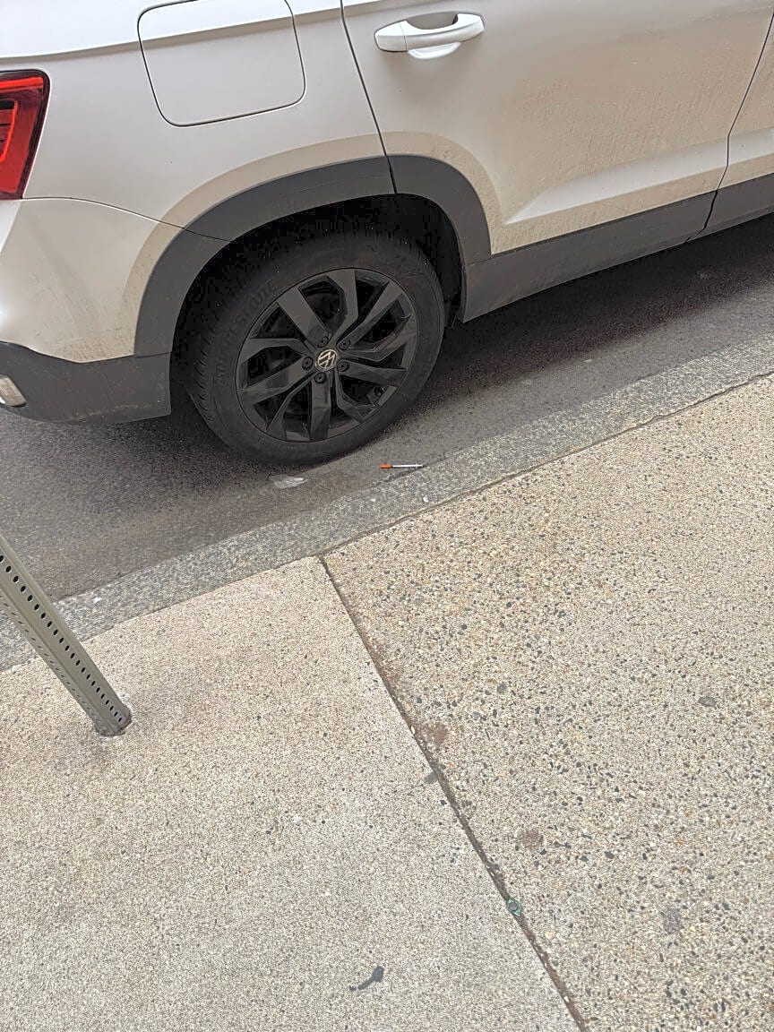 CLOSED #101006449814Resolved. No syringes recovered from entrance or station drug panel you found.If syringes are seen, please resubmit.Requests with a picture or a phone number to help us locate syringe.