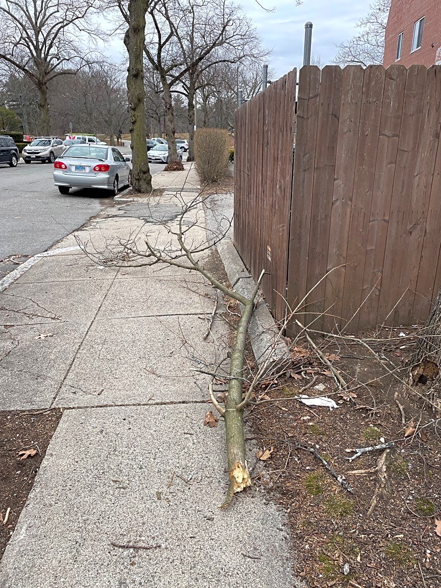 93 Moraine St, Boston, MA 02130Large branch/deadwood blocking sidewalk. We use this sidewalk daily with large groups of young school children so we’d be grateful if someone could come remove it. Thank you so much!