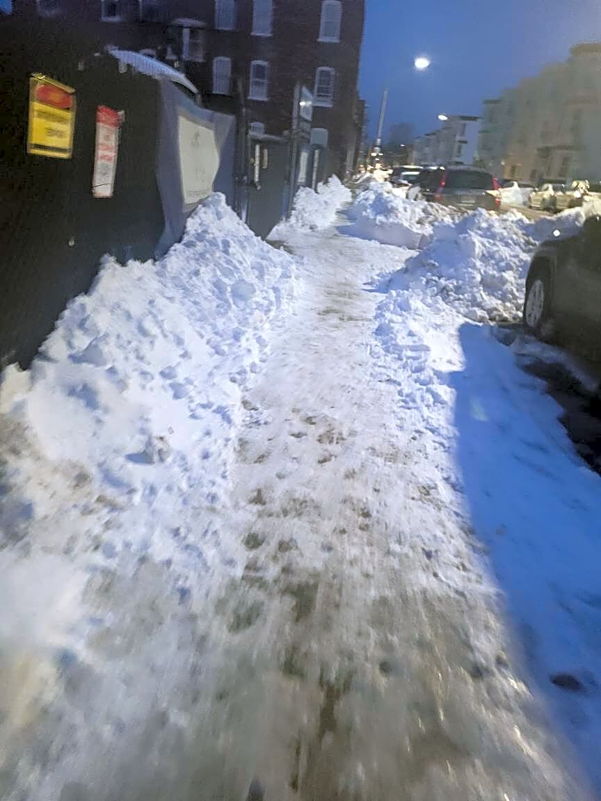 158 Kelton St, Allston, Ma, 02134158 Kelton St has not shoveled properly. It is too narrow in several areas for me to be able to use my walking cane. Like a foot wide, maximum. It's also not all the way down to the pavement, so the ice and snow made me slip.