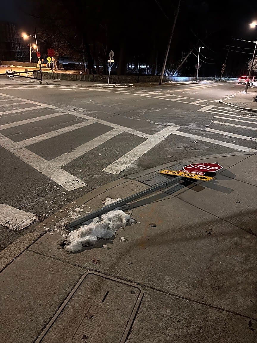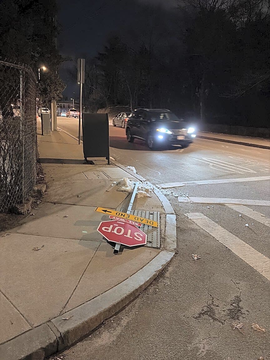 Intersection Of Park Ln And Walnut Ave, Jamaica Plain, MaDowned stop sign at intersection - cars now driving through intersection without stopping; crash hazard - please address promptly!