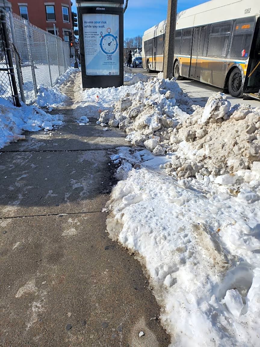 129 135 Columbia Rd, Dorchester, Ma, 02121Snow Removal by City is incomplete. Access from road to bus stop has large mound of snow due to snow plow and city needs to give access to pedestrian standing at stop.