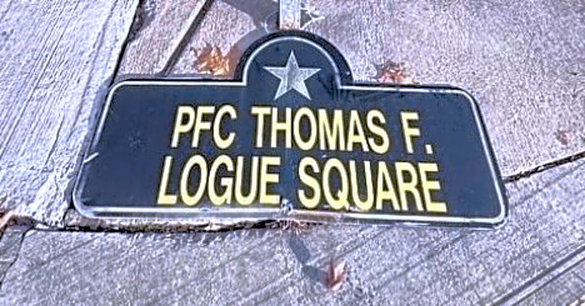 Intersection Of Chestnut St And Monument Sq, Charlestown, MaThis sign was damaged and disappeared during corner snow removal. Please have a replacement sign for the veteran installed. PFC Thomas F. Logue Square