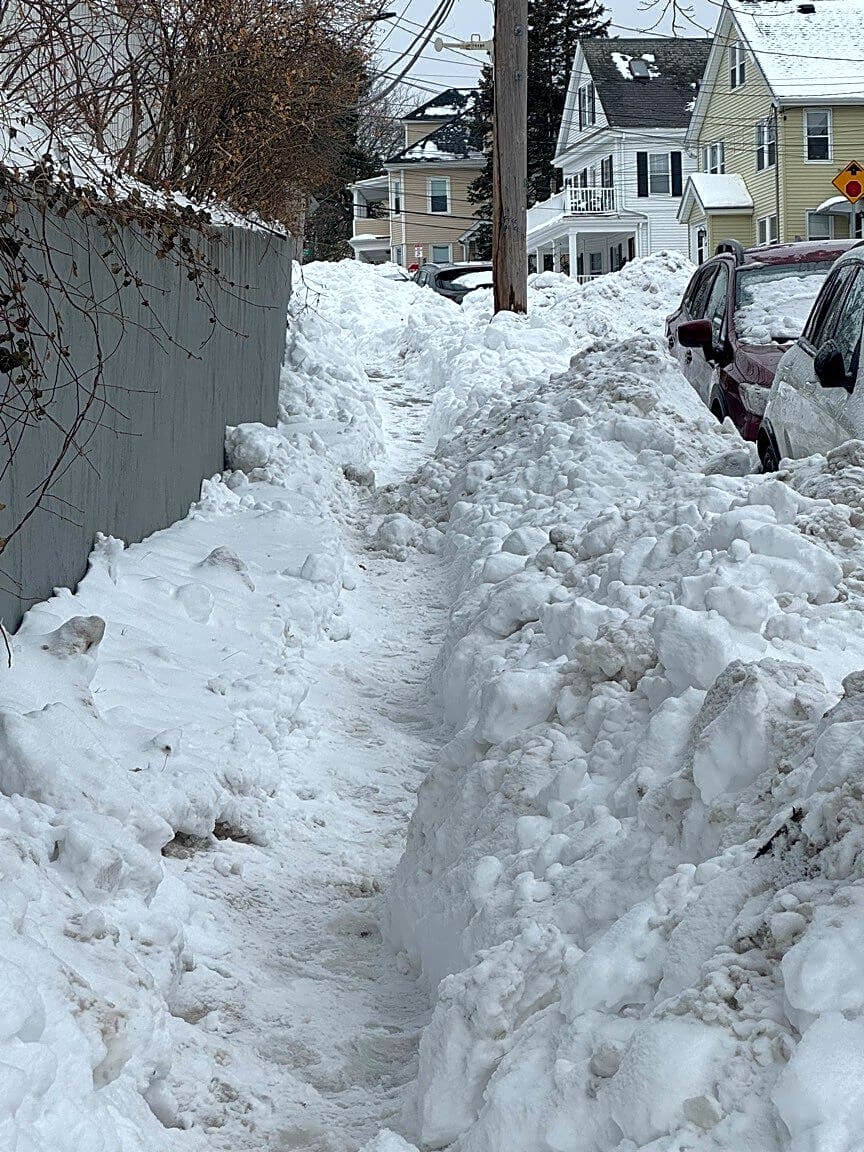 56 Bellevue St, West Roxbury, Ma, 02132Sidewalk not cleared, all the way around this corner lot.