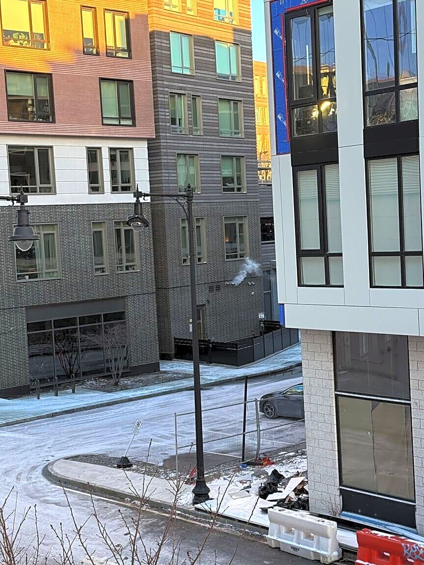 36-38 Hichborn St, Boston, MA 02135The street light at the corner of Hichborn Street and the alley that leads to Arthur street (approximate coordinates - 42°21'21.7"N 71°08'36.6"W) is bent so that light shines into our apartment instead of down onto the street. The construction workers who are working on the Vera building probably knocked this lamp with their crane while working on the building for the past 1+ years.