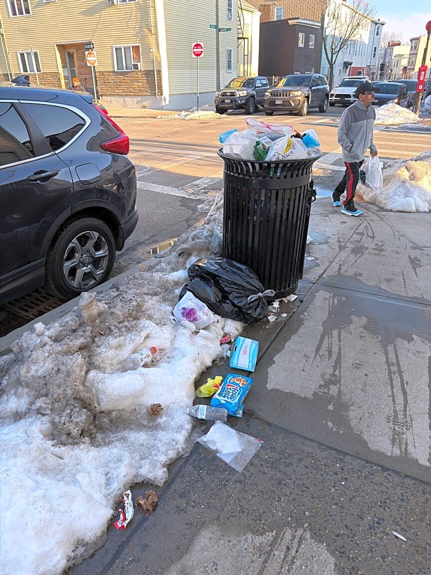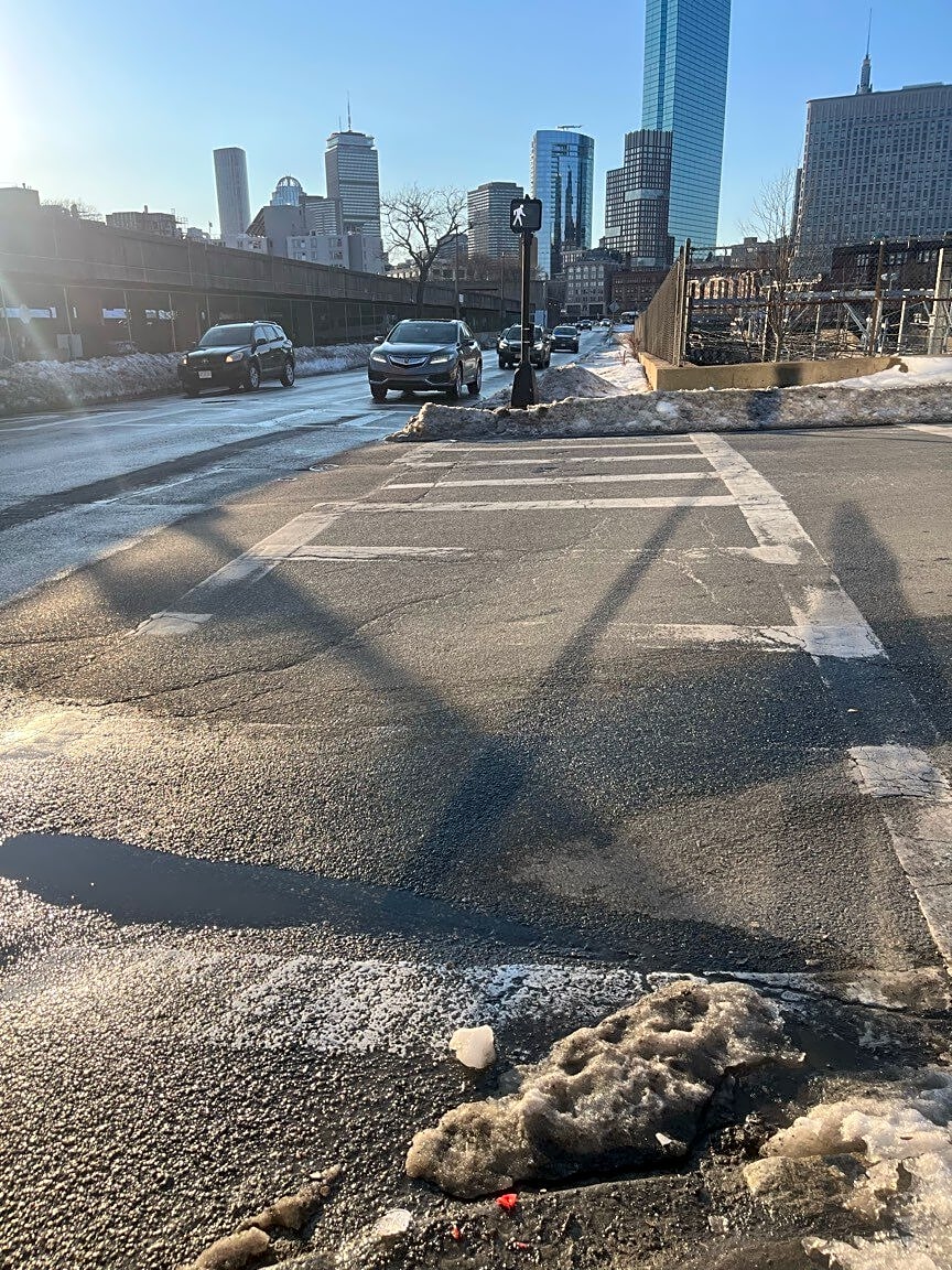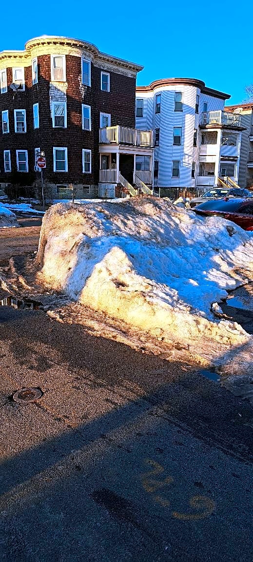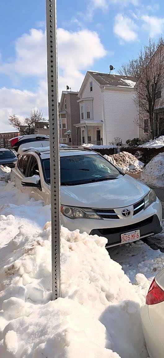 100 Sanborn Ave, West Roxbury, Ma, 02132White jeep in front of 102 Sanborn Ave . It’s parked next to a non shoveled snow bank. It’s in the middle of the road.