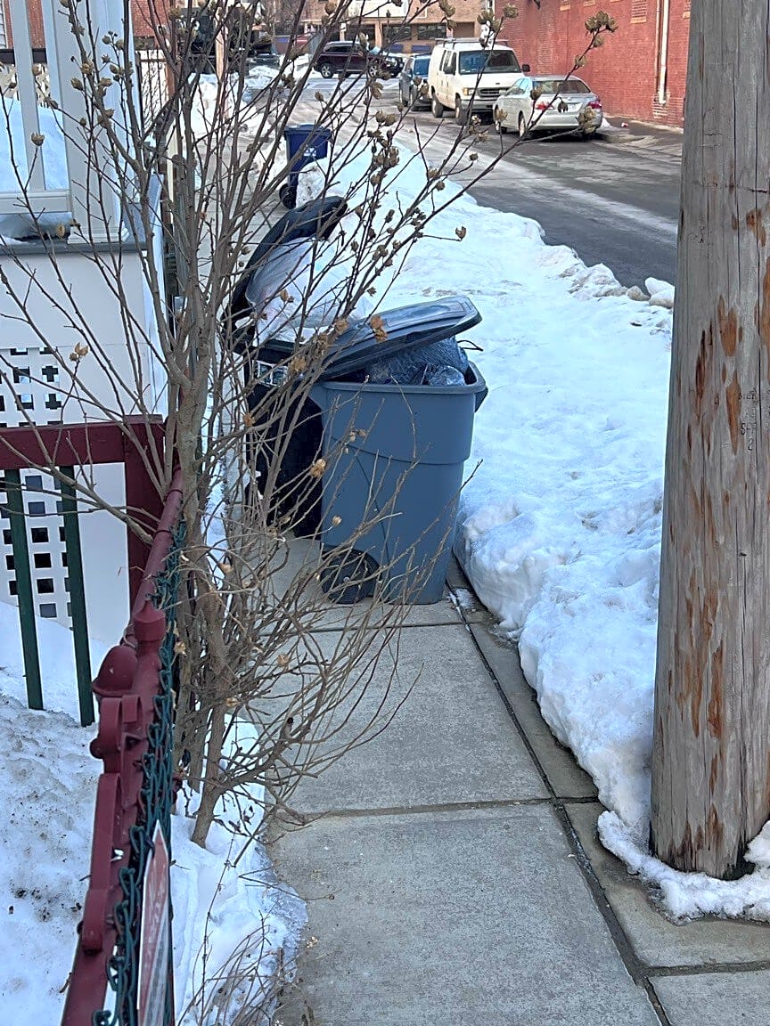 17 Kimball St, Dorchester, Ma, 02122Trash cans blocking the sidewalk. Property management refuses to clear the snow.