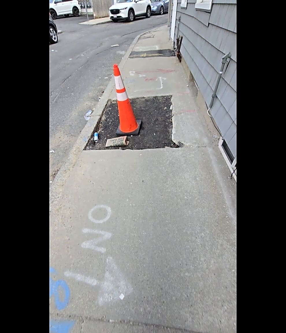 11 Woodward St, South Boston, Ma, 02127A section of sidewalk in front of 9, 11 and 13 Woodward Street was removed weeks ago and has not been repaired. Up until a couple days ago, a traffic cone was placed in the section of sidewalk that was removed. Before the sidewalk was removed, I fell and injured my ankle. The section of sidewalk that was removed was not marked and was not obvious. Additionally, the roadway on Woodward Street is in a dilapidated condition. Several contractors have dug up the roadway and sidewalks and have failed to safely and adequately repair the roadway and sidewalks. Work has created a chain effect of issues in other areas of the road and sidewalk. There are several areas of Woodward Street that are not ADA compliant. Children, seniors and people with disabilities cannot safely walk the sidewalks and in some instances, find themselves having to walk into the roadway, which is also in disrepair. Between 9 Woodward and the rear of 510 Dorchester Ave, there is a hole in the walkway which appears to have been a utility pipe. It poses a significant tripping hazard because the hole is not filled or covered. There are several large cracks, breaks, potholes and unstable roadway which raises concerns of sink holes developing. Please fix our road and sidewalk! Our road has been neglected and poorly patched up by contractors for many years.