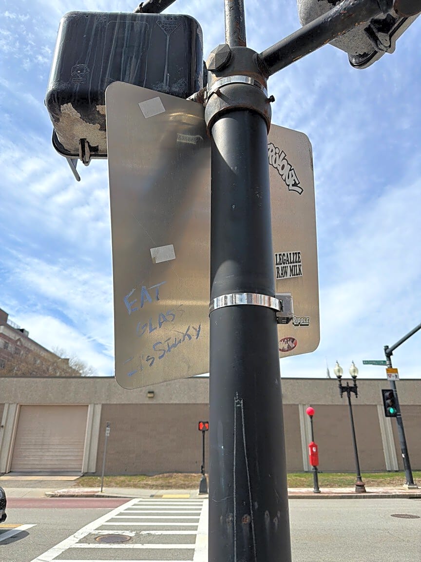 Intersection Of Traveler St And Washington St, Roxbury, MaDamaged and offensive sign please replace multiple requests for two years thank you. It suggest we should eat glass! And it’s barely hanging on.