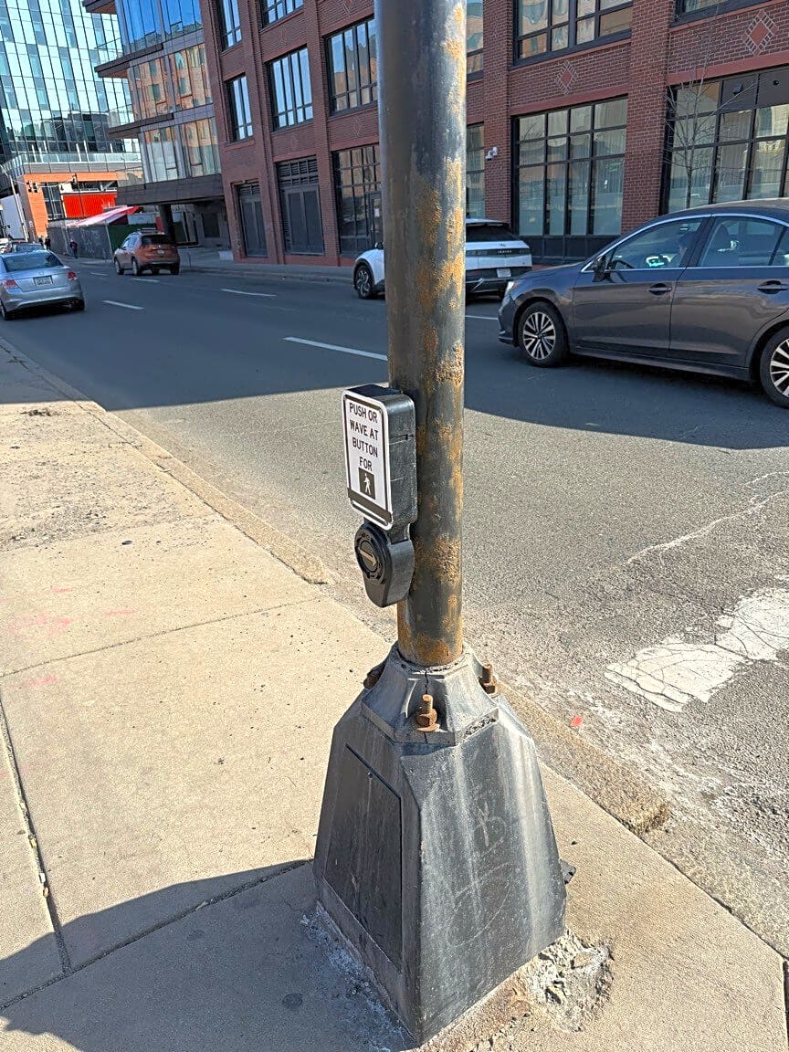 Intersection Of Herald St And Shawmut Ave, Boston, MaThere is no button for the pedestrian cross light when walking on the left side of Shawmut Ave at the intersection Herald Street/Shawmut Ave coming from Marginal Road. The button shown is to cross Shawmut Ave.