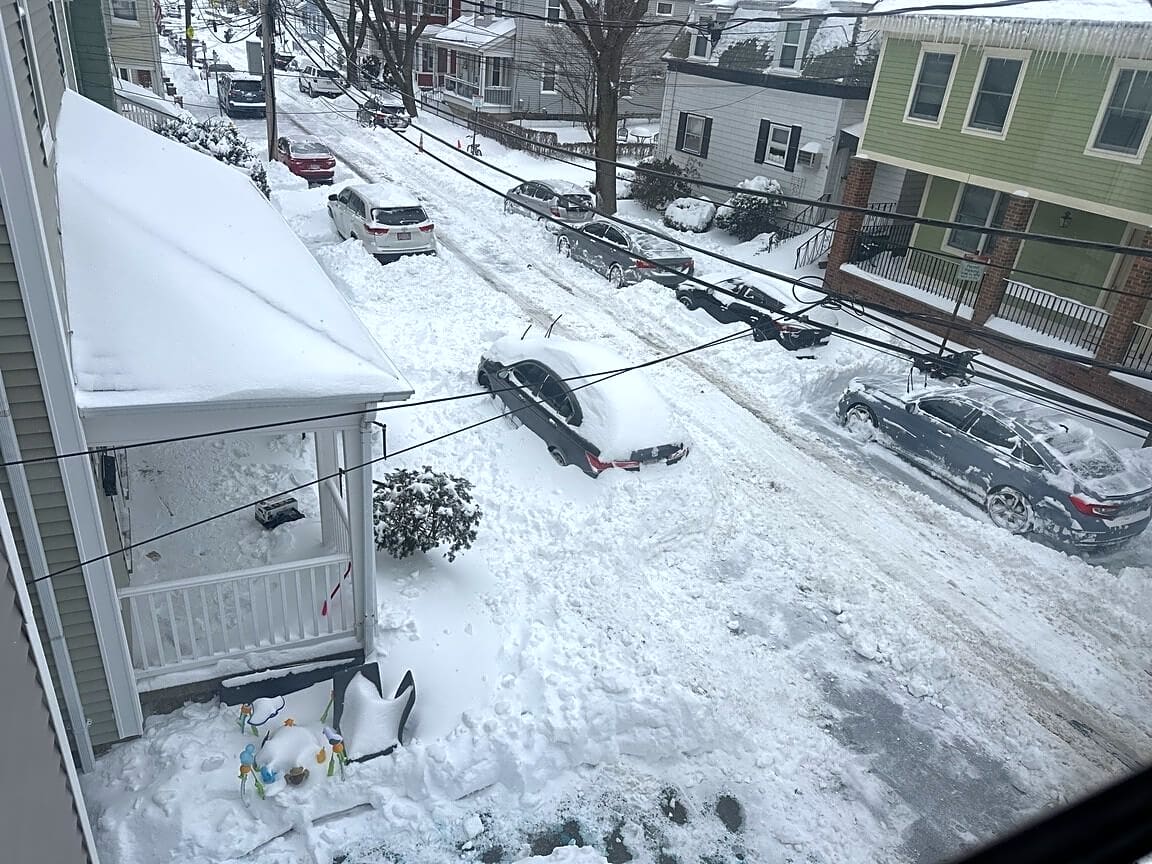 102 Edgemere Rd, West Roxbury, Ma, 02132There is a white four door car parked on the street and the plows can not clear the street.