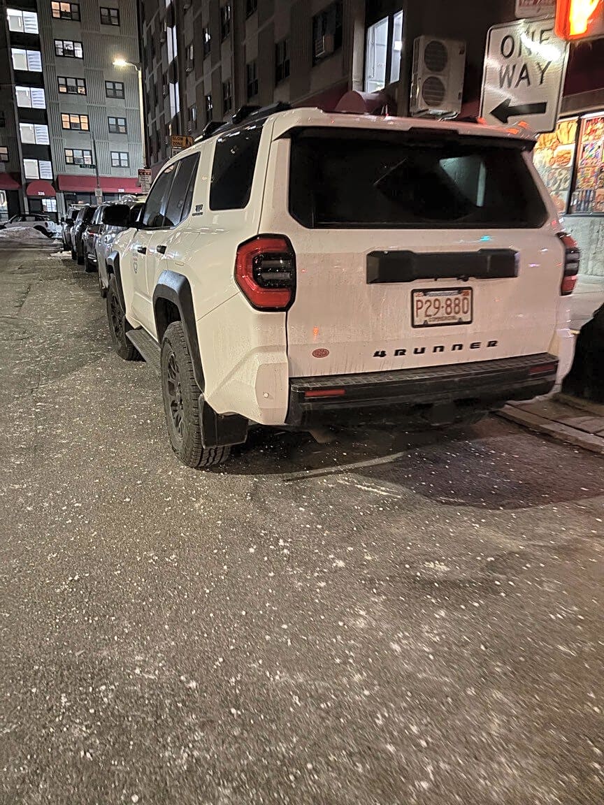 Intersection Of Montgomery St And W Canton St, Boston, MaRed jeep. No resident sticker and parked at least two feet from the curb...