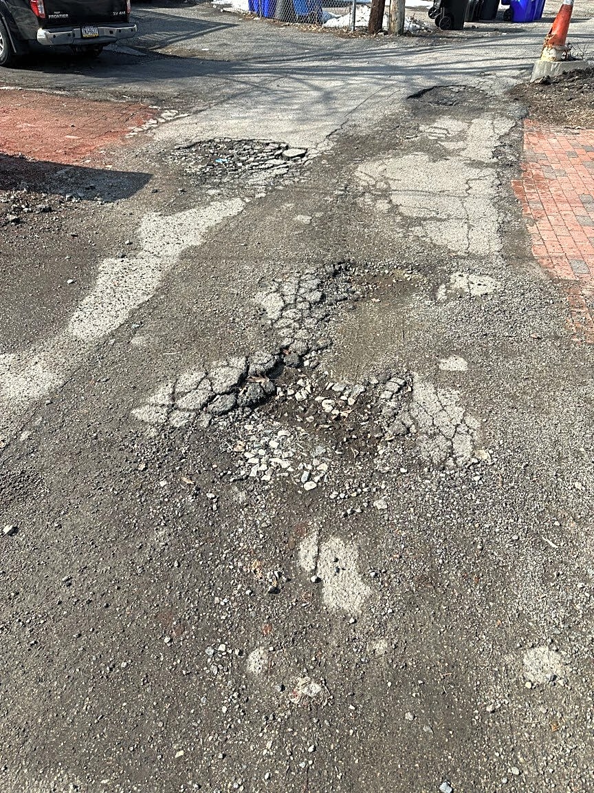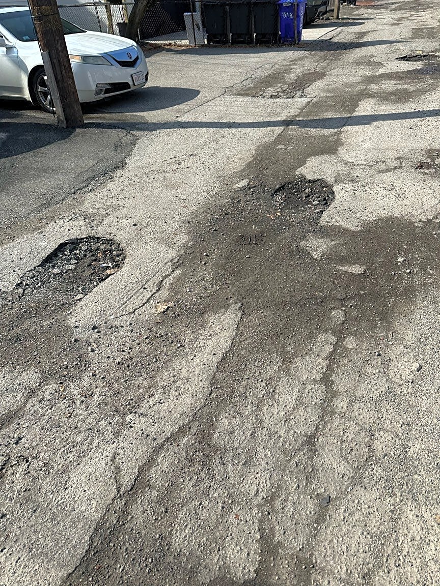 1759 Commonwealth Ave, Brighton, Ma, 02135Many major potholes in side street that is driveways and parking for us on Comm Ave., Wallingford and Leamington. Trash trucks and delivery vans and go back here as well. Entrance to street is off of Leamington