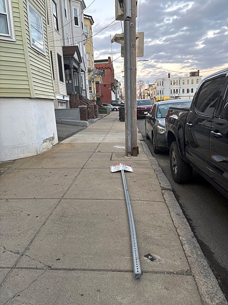 Intersection Of Barnes Ave And Saratoga St, East Boston, MaSign down with pole please fix thank you blocking sidewalk in front of liquor store, Woody’s liquor thank you