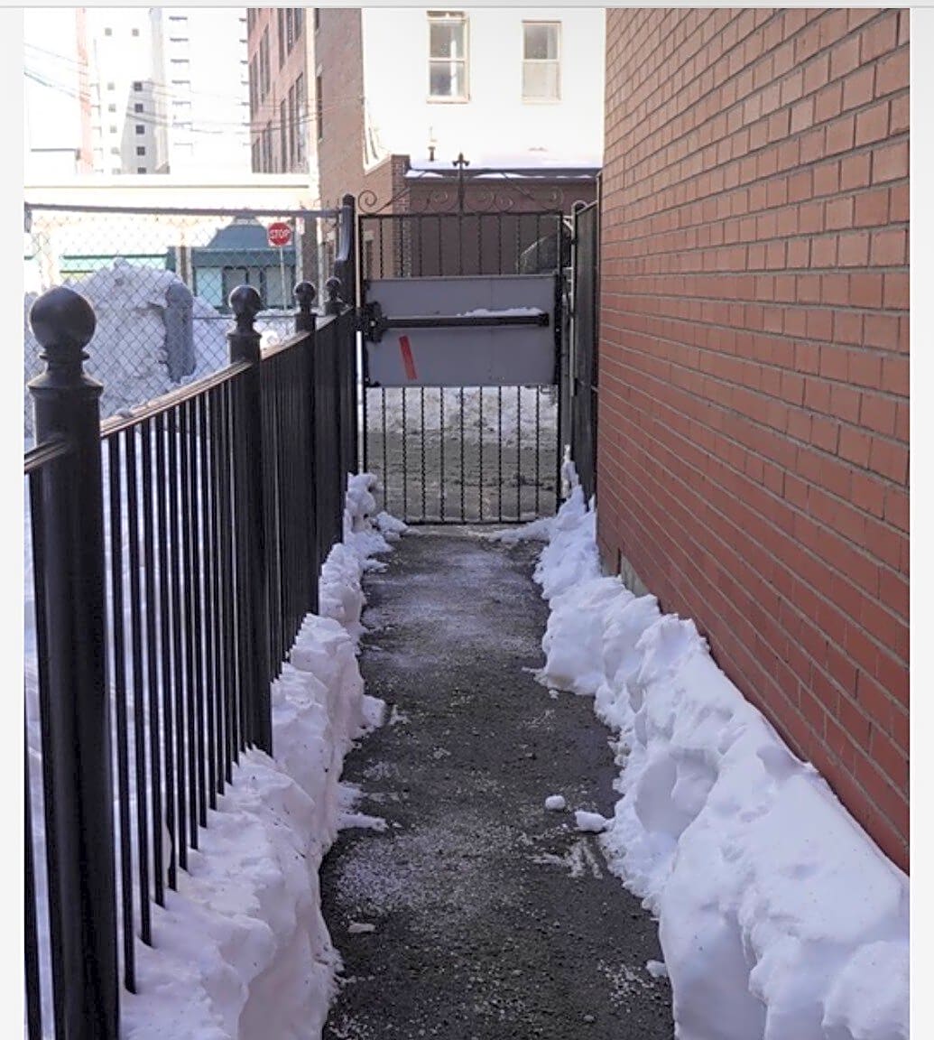 40 Fay St, Roxbury, Ma, 02118Snow plow plowed snow bank into our emergency / handicapped exit.